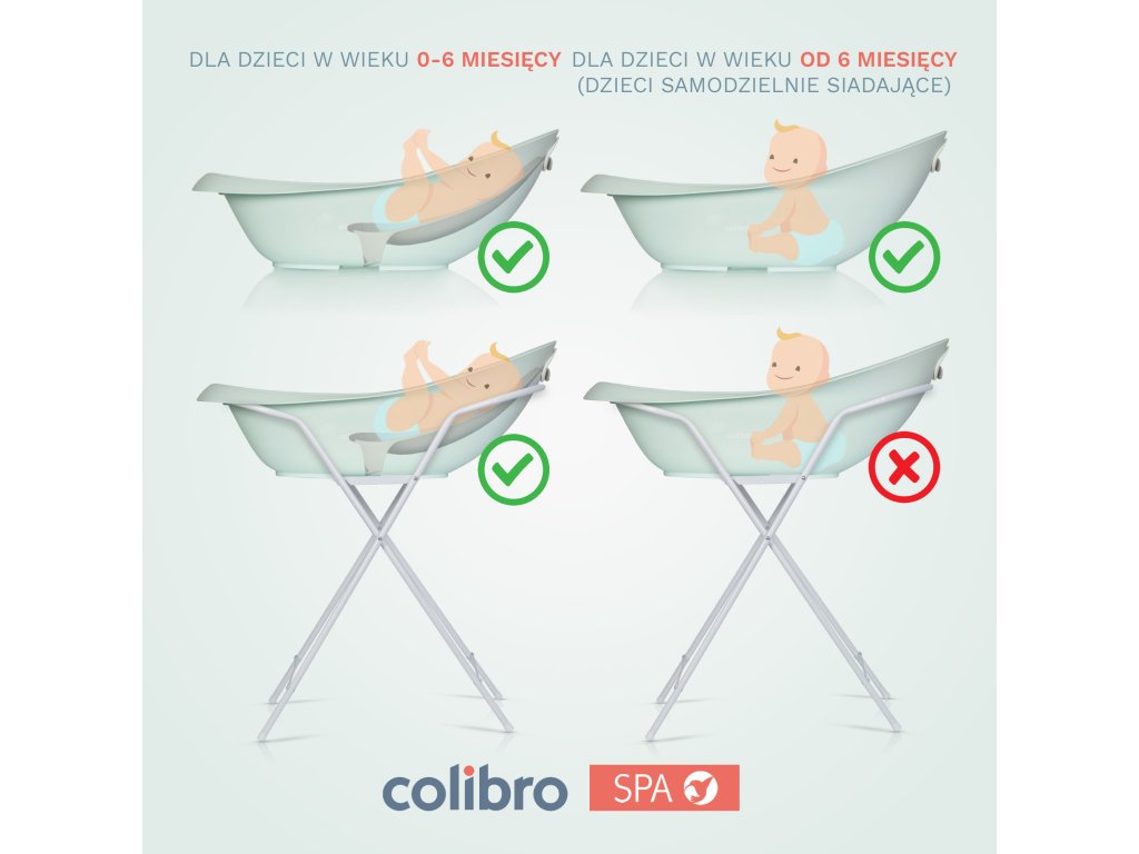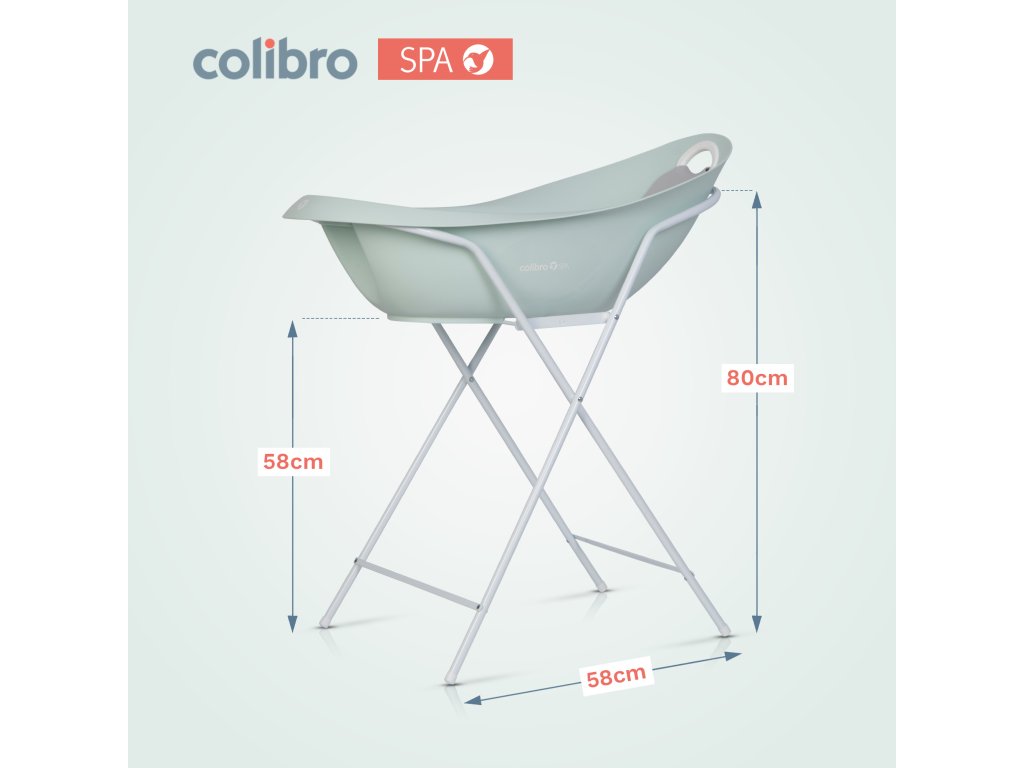 Az állványt kifejezetten a Colibro Spa kádhoz tervezték, biztosítva annak stabilitását és biztonságát. Magasság 58 cm Optimális azoknak a szülőknek, akik teljes mértékben kézben tartják a baba fürdetését. Fontos megjegyezni, hogy az állvány csak 6 hónaposnál fiatalabb csecsemők számára készült, akik még nem ülnek önállóan. Amint a baba elkezd ülni vagy megpróbál kimászni, ajánlott a kádat a padlóra helyezni.