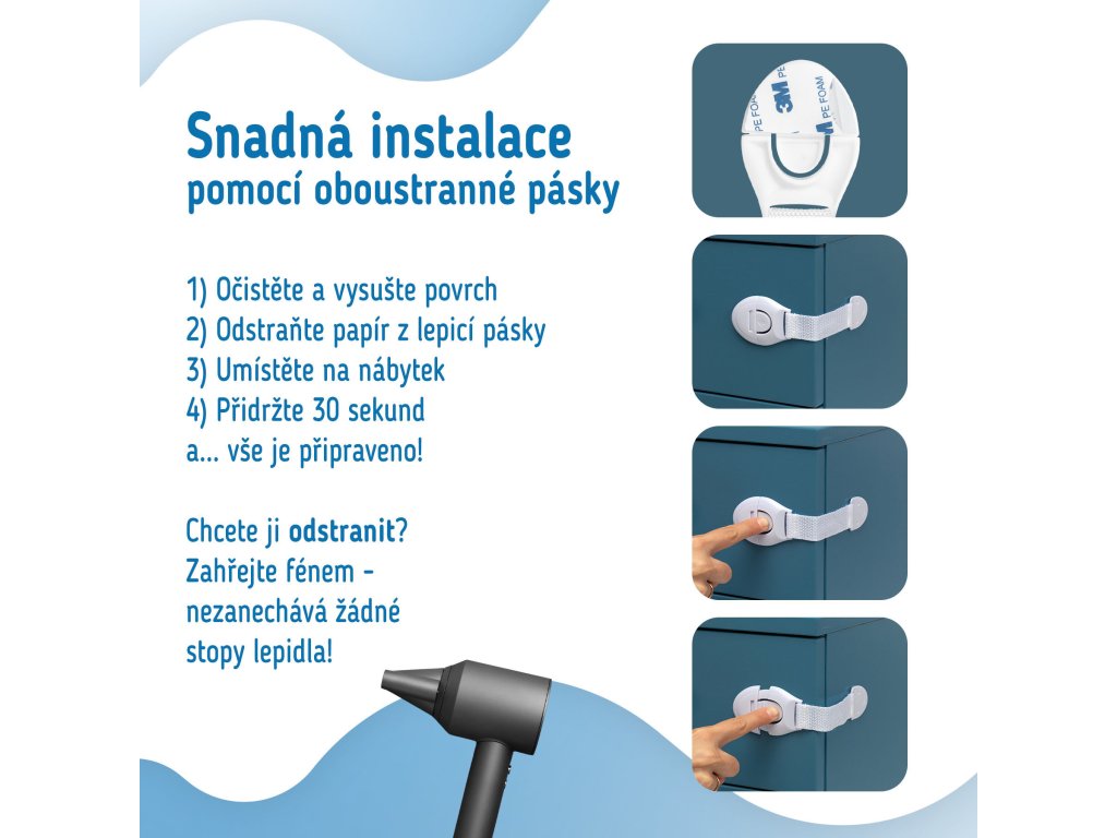 Nagyon könnyen használható, a zár kétoldalas ragasztószalaggal rögzíthető a bútorhoz. A nyitáshoz egyszerűen meg kell nyomni a záron található reteszelő mechanizmust. Könnyen kezelhető lesz számodra, de egy gyereknek nehéz lesz kinyitni a zárat.