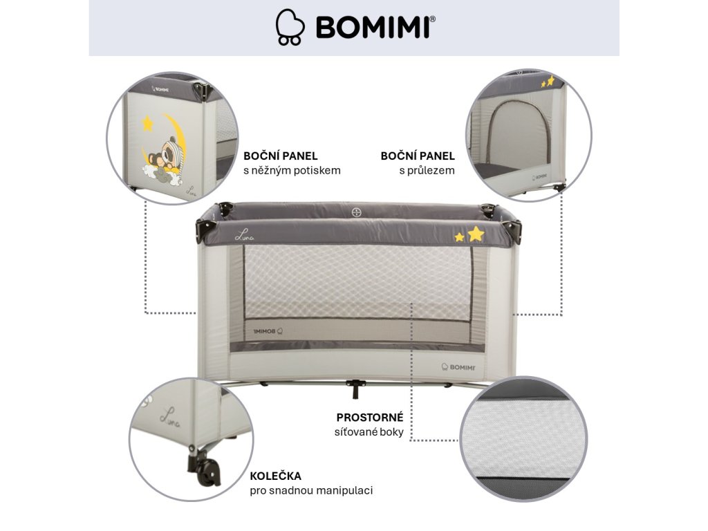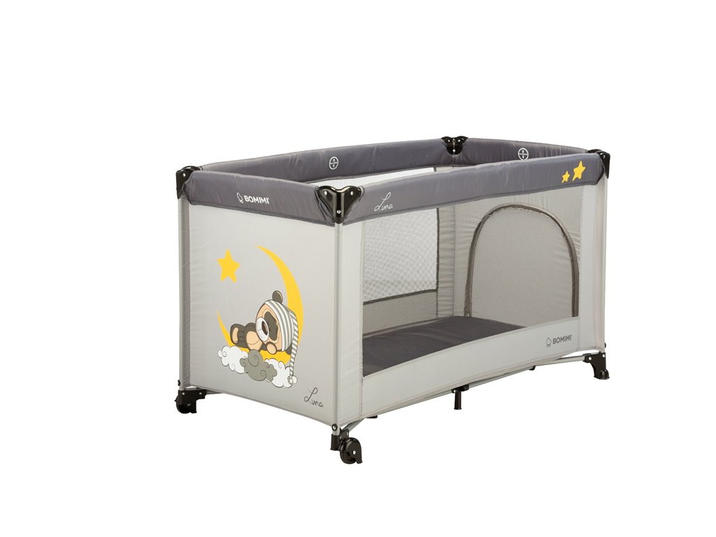 A kiságy egyik hálós oldala lecipzározható, így a gyerek kényelmesen ki-/be tud mászni a kiságyba.