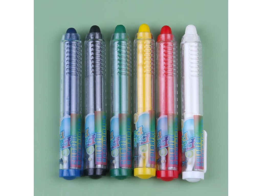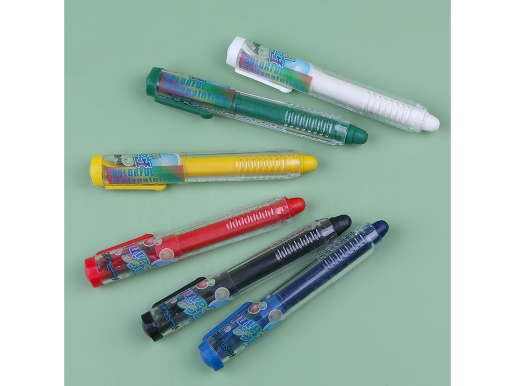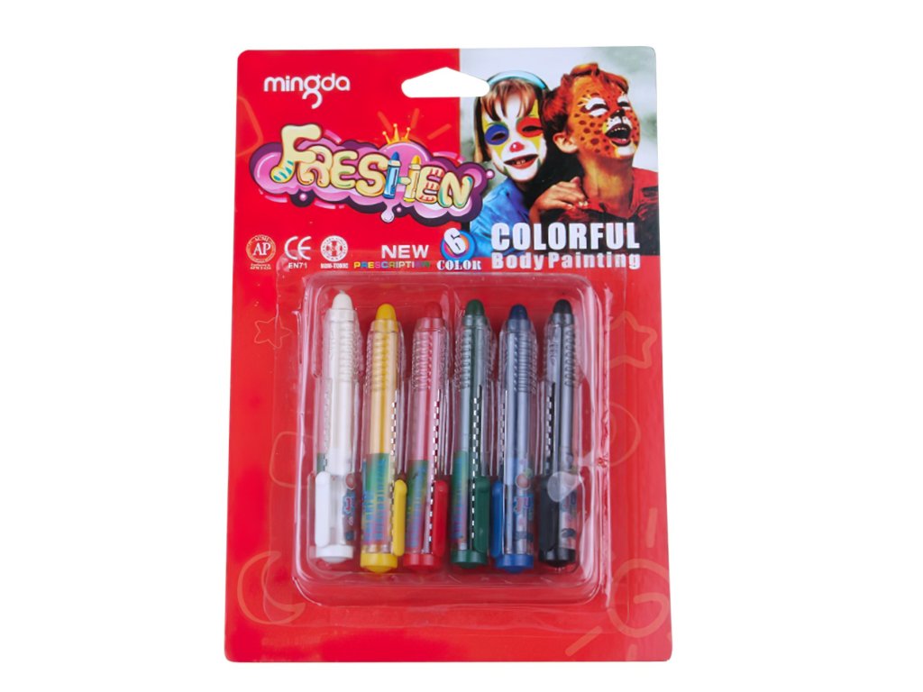 Gyerek arcfesték készletA ceruza 6 alapszínt tartalmaz - fehér, sárga, piros, zöld, kék és fekete. A behúzható ceruzák praktikus kialakítása egyszerű és tiszta felvitelt biztosít közvetlenül a ceruzára.arcvagy testen ecset vagy szivacs nélkül.