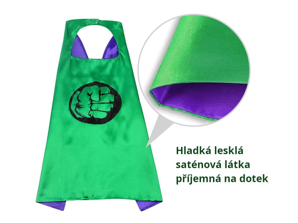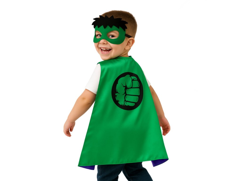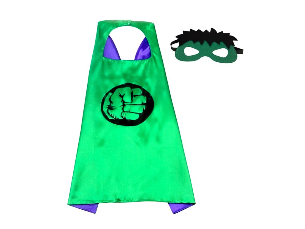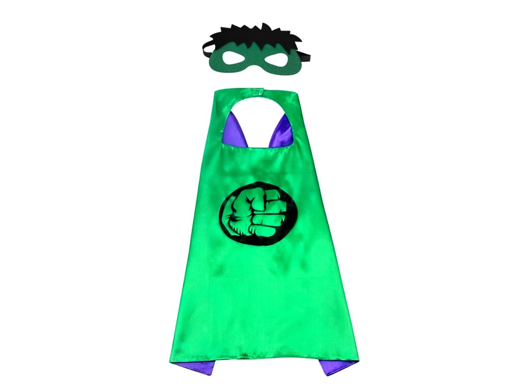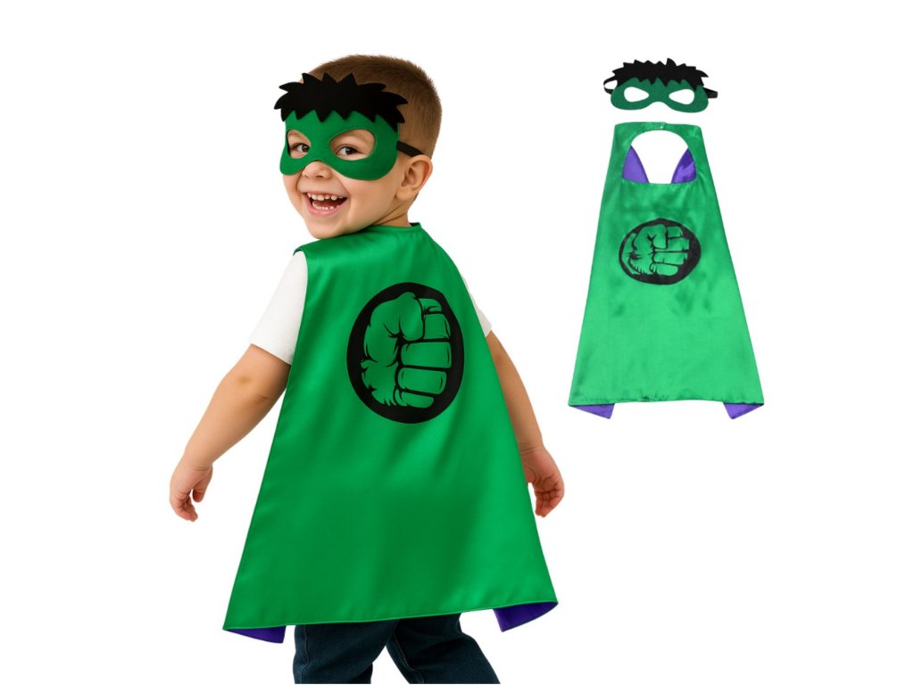 Ez a stílusos szett egy fényes zöldből állköpenyikonikus motívummalHulk ökleiés továbbimaszkokfekete hajjal és zöld szegéllyel a szeme körül. A gyerekek félelem nélküli lényekké változnak.Bosszúállóés ők lesznek mindenki sztárjaikarnevál vagyszületésnapi buli.