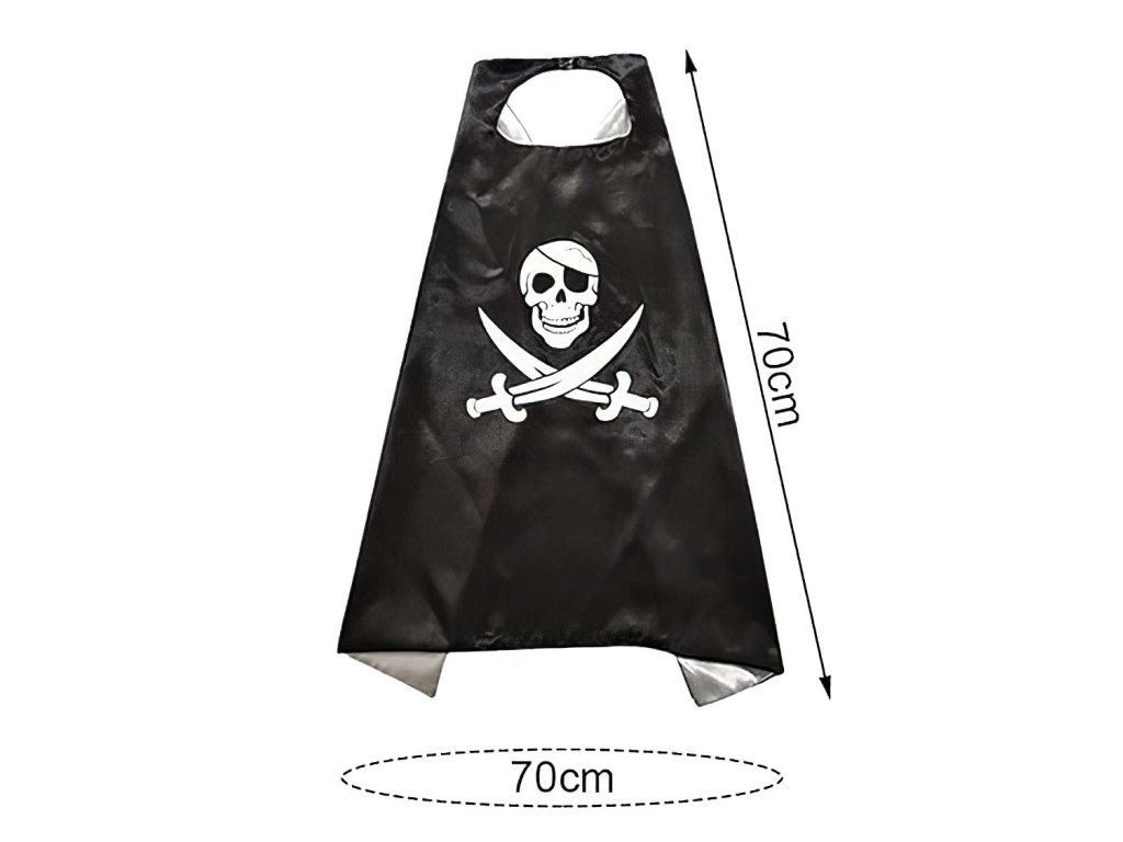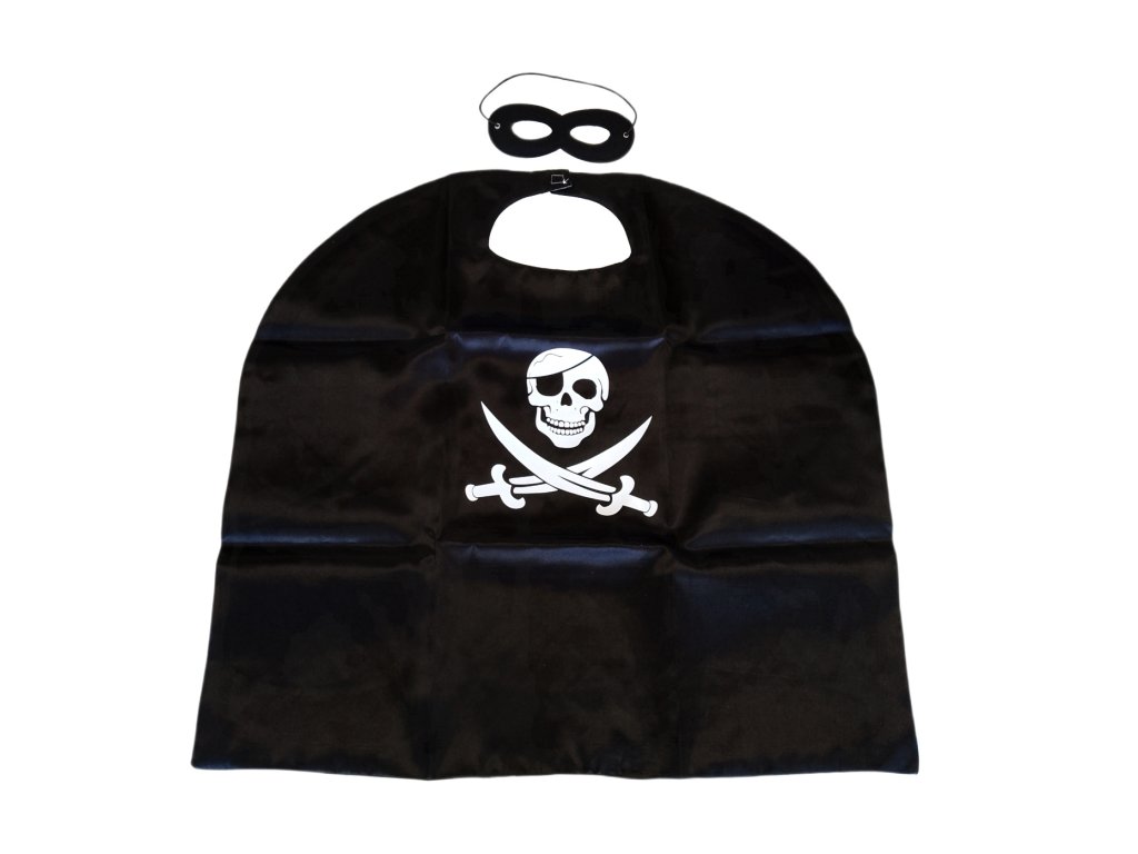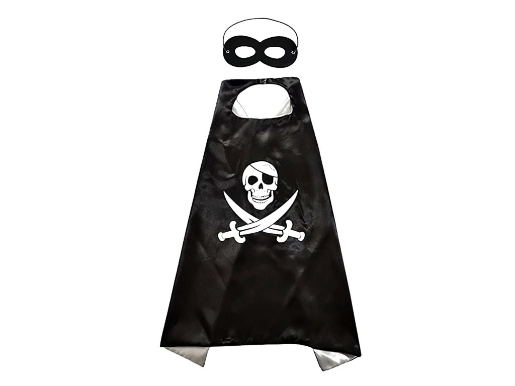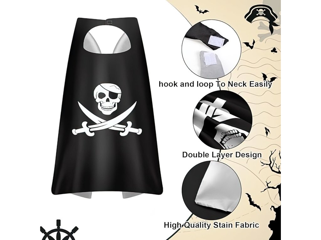 A szett tartalmaz egy feketepalástklasszikuskalózkoponya, keresztezett kardok és fekete szimbólumaa maszka szemnek az autentikusértkalózmegjelenés.