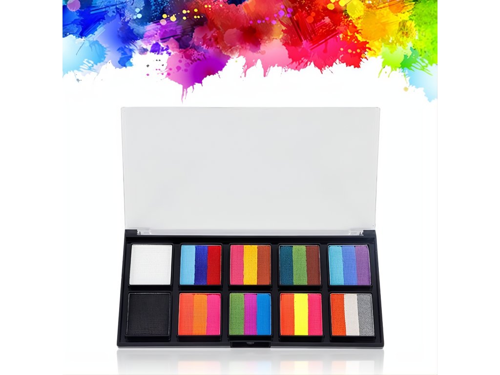 A csomag 12 darabot tartalmazintenzív színblokkokTíz közülük három árnyalatot kombinál, így könnyen keverhetők és alkothatók.szivárványhatások. Festékekmindhárom tónusban egyetlen húzással felvihető és ecsettel elkészíthetőeredeti kombinációk, alakzatok és átmenetek.