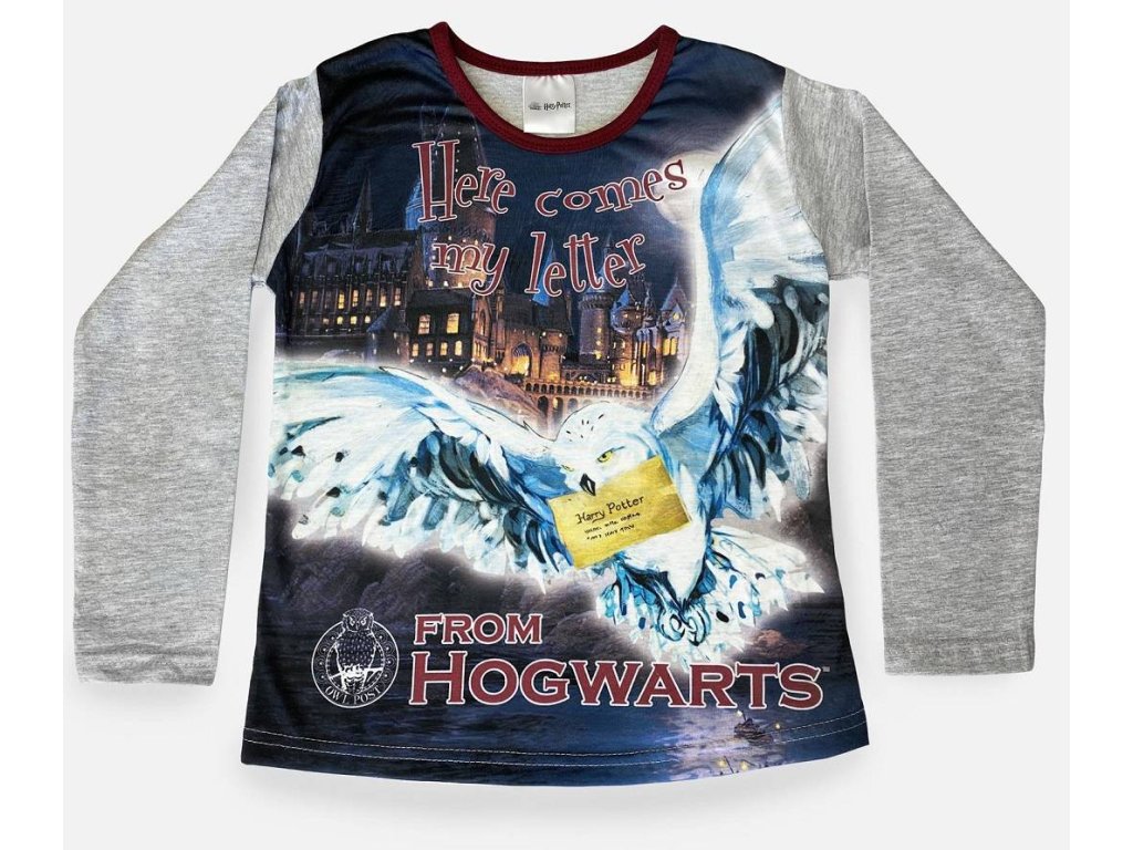 A pizsama felső részét valósághű Hedwig repülésben és a háttérben a Roxfort kastély nyomat díszíti. Hedwig figurája fölött a „Itt jön a Roxfortból a levelem” felirat található, amely a gyerekeket abba a pillanatba repíti, amikor saját felvételükre várnak a Roxfort Boszorkány- és Varázslóiskola diákjai közé. A szürke ujjak kontrasztot alkotnak a sötétebb középponttal, ami egy elegáns és stílusos megjelenést kölcsönöz minden fiatal bűvésznek.