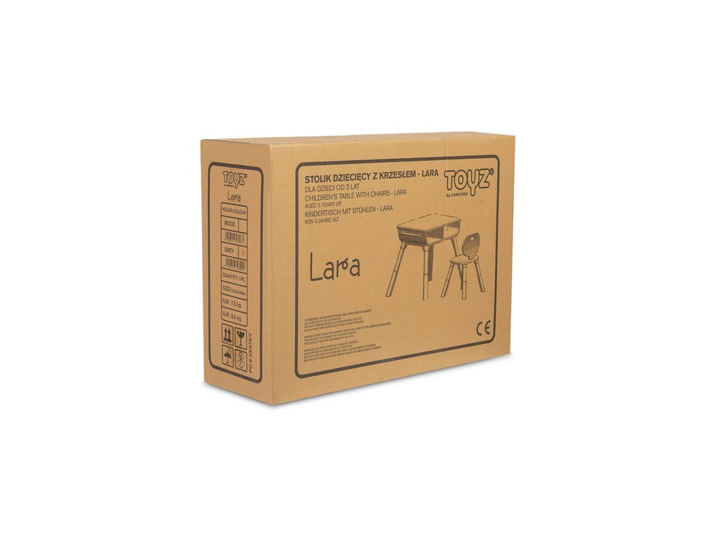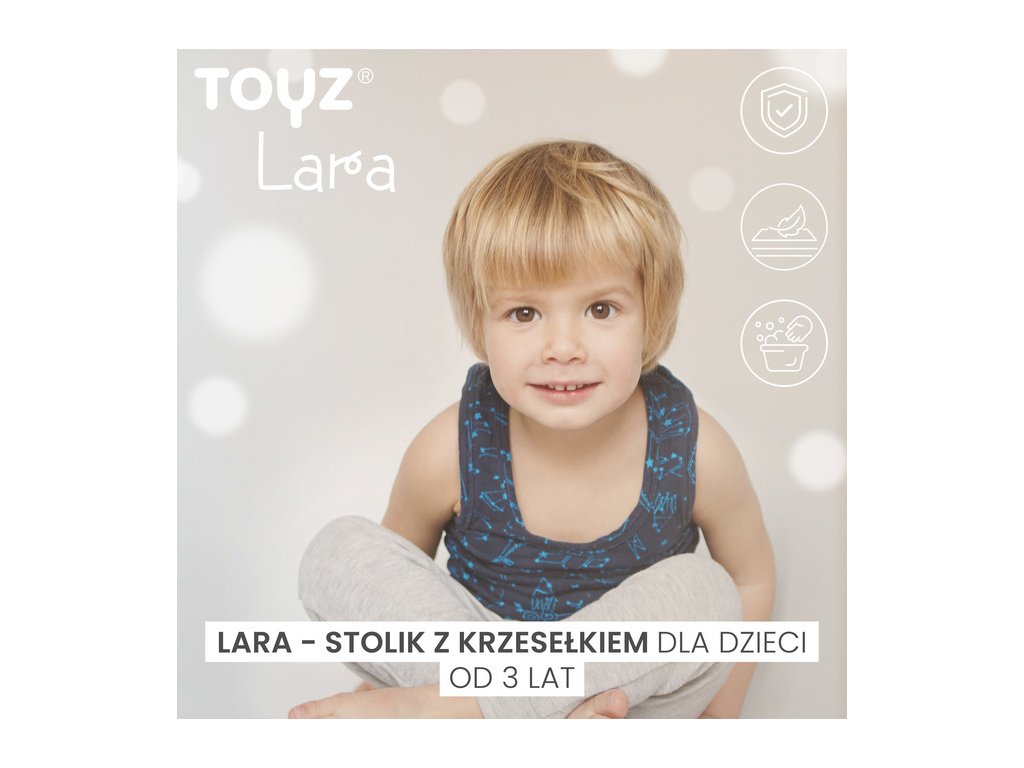 A Lara asztal és szék készlet, amely első íróasztalként szolgál kisgyermekek számára. Helyet biztosít kreatív játékhoz és tanuláshoz 3 éves kortól. Masszív szerkezete garantálja a biztonságot és kényelmet a mindennapi tevékenységek során. A Lara nemcsak a gyerekszoba funkcionális eleme, hanem nagyszerű játék és oktatási segédeszköz is.