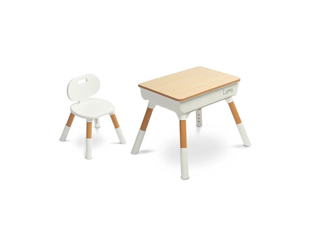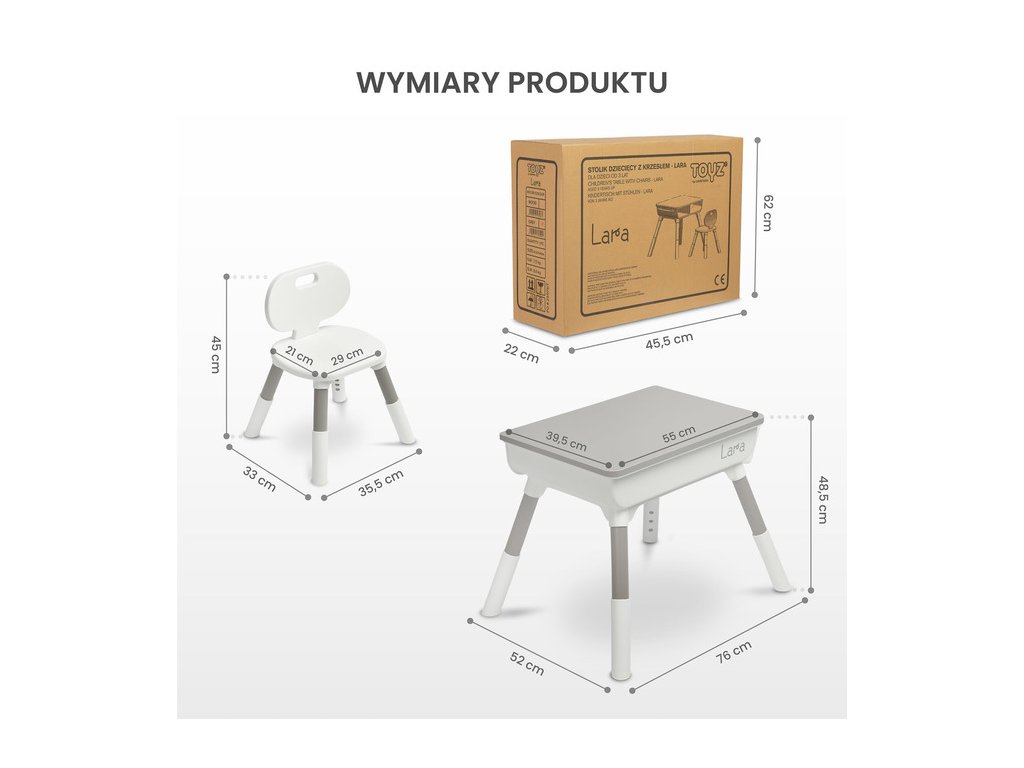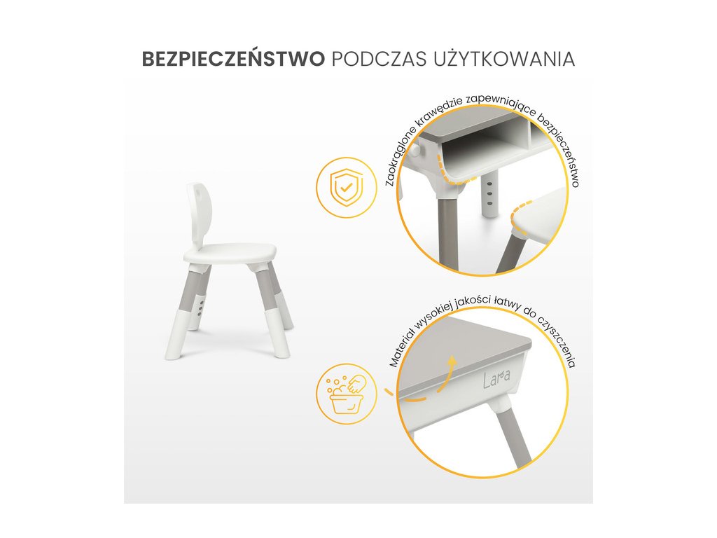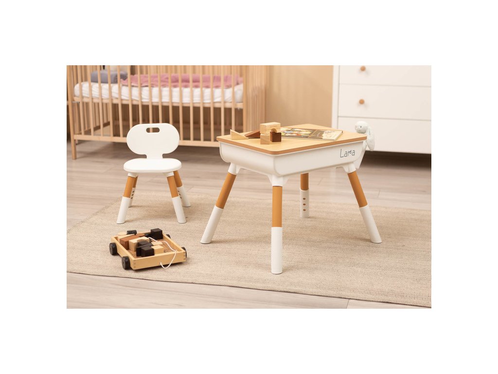 A Lara tökéletes első asztal 3 éves kortól, amely ötvözi a funkcionalitást, a biztonságot és a stílusos dizájnt. Ez a kompakt asztal- és székkészlet elegendő teret biztosít a kreatív játékhoz és tanuláshoz, miközben ergonomikusan úgy van kialakítva, hogy a gyermek fejlődésének minden szakaszát támogassa az állítható magasságnak köszönhetően.