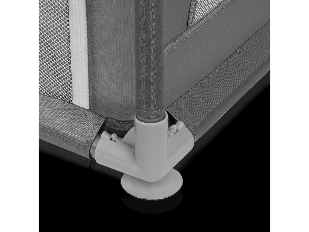 A gyermek biztonsága érdekében minden szerkezeti elem a járóka külső oldalán található, és emellett védőhabbal van bevonva. Az egész 2,5 cm átmérőjű acélcsövekkel van megerősítve, amelyek biztosítják a stabilitást. Valamint a cipzárak a járóka külső oldalán vannak, és nem férhetnek hozzá a gyerekek, így csak a szülő irányíthatja az oldalsó bejáratok zárását és nyitását. A járóka sarkaiban 4 tapadókorong található, amelyek kiváló tapadást garantálnak még csúszós felületeken is, mint például csempe vagy panel, így a termék bármilyen helyre alkalmas.