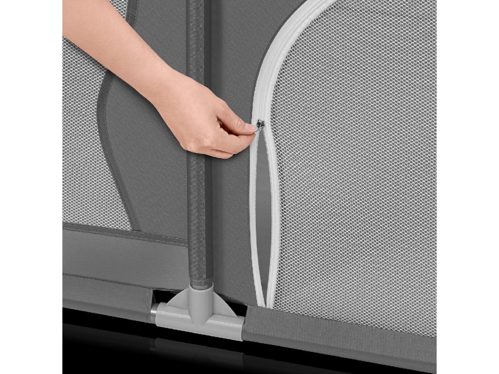 A játszótér elkülönítésével a szülők más feladatokat is elláthatnak, amíg a gyermek biztonságos helyen van. A két oldalsó cipzáras bejárat lehetővé teszi a tér teljes irányítását - a cipzár kívülről van, így csak a szülő dönthet a nyitásról. A termék szerszám használata nélkül szét- és összeszerelhető, a készletben található kompakt méretek és táska pedig egyszerű tárolást tesz lehetővé. A járóka anyaga könnyen tisztán tartható, így a termék hosszú évekig kitart.