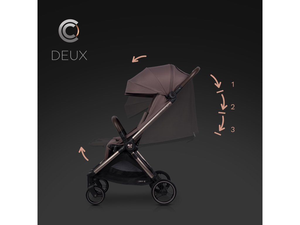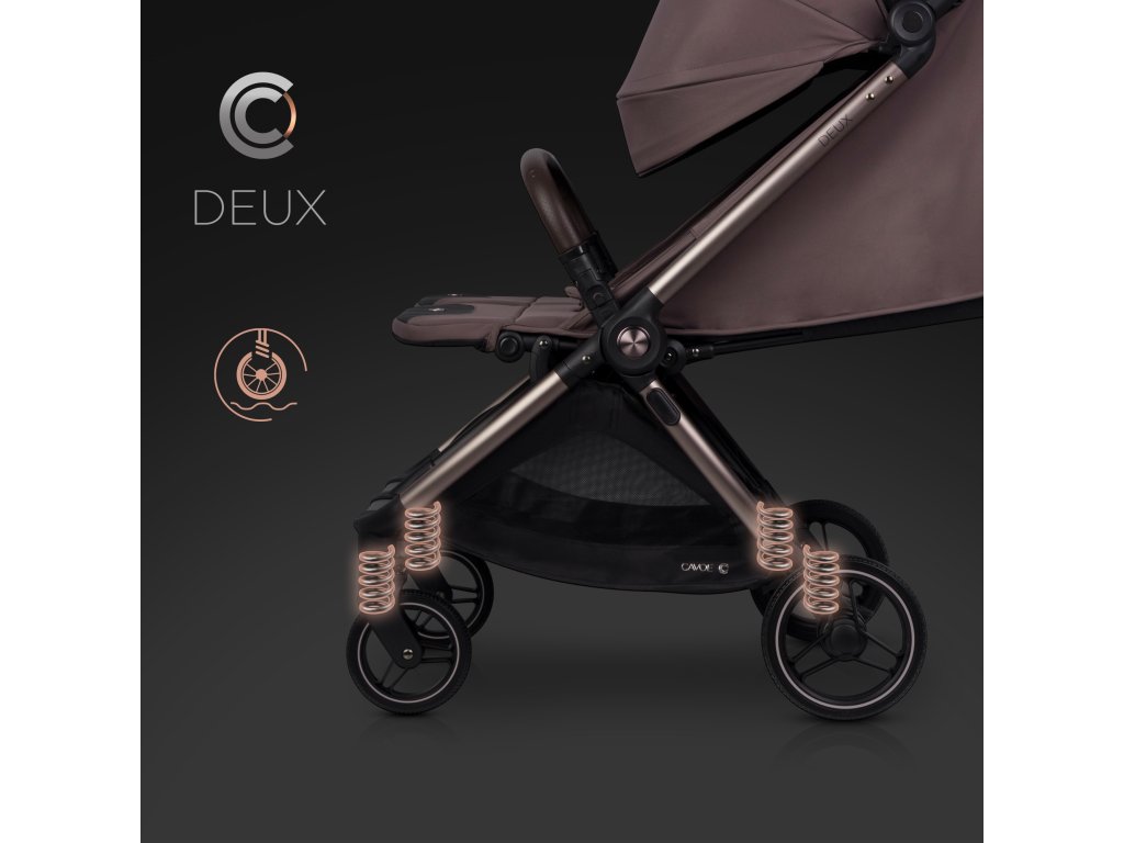 A CAVOE DEUX egy prémium termék, amely még a legigényesebb szülők elvárásait is kielégíti. A váz fém elemei divatos és elegáns barna-pezsgő színűre eloxáltak. Az eloxált váz sokkal karcállóbb, mint a hagyományos festett felületek, ami azt jelenti, hogy a babakocsi évekig tartó intenzív használat után is megőrzi tökéletes megjelenését.