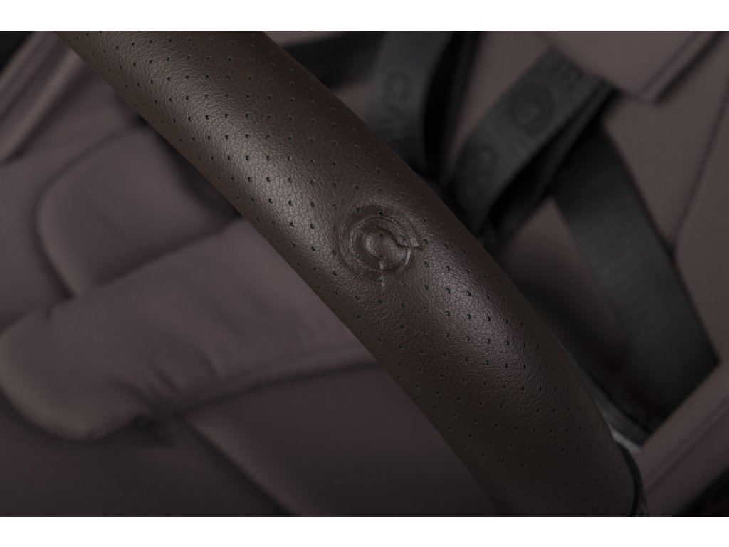 A babakocsi fogantyúja és a biztonsági korlátok a legmagasabb minőségű, szellőző eco-bőrrel vannak bevonva, divatos sötétbarna színben. A bőr puha és kényelmes, így a babakocsi kezelése és hordozása sokkal kényelmesebb.