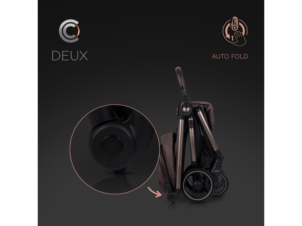 A DEUX egyedülálló automatikus összecsukórendszerrel van felszerelve, amelyet egy kézzel is működtethetsz. Egyszerűen aktiváld a mechanizmust, és told előre a fogantyút - a babakocsi automatikusan összecsukódik, mint egy inga, meglepően kompakt méretekre. Összecsukás után a babakocsi függőlegesen áll, és a korlát kényelmes hordozófogantyúként szolgál. Ez a rendszer hatalmas megkönnyebbülést jelent, különösen azokban a helyzetekben, amikor a babakocsit a csomagtérbe kell pakolni, és egyszerre két gyermeket kell felügyelned. Az ikrek számára babakocsi összecsukása még soha nem volt ilyen egyszerű.