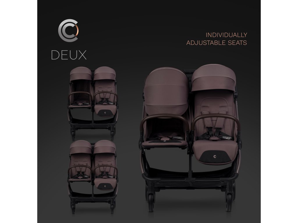 Minden ülés 3 pozícióba állítható háttámlával rendelkezik, amely a következő pozíciókat tartalmazza: teljesen fekvő, félig fekvő és teljesen ülő. A DEUX babakocsi lábtartói is állíthatók, és teljesen összecsukva kényelmes feljutást biztosítanak egy idősebb gyermek számára a lépcsőfokhoz. Az ülés szélessége 32 cm, a háttámla magassága 46 cm, az ülésmélység pedig 20 cm, ami elegendő helyet biztosít a kényelmes üléshez.