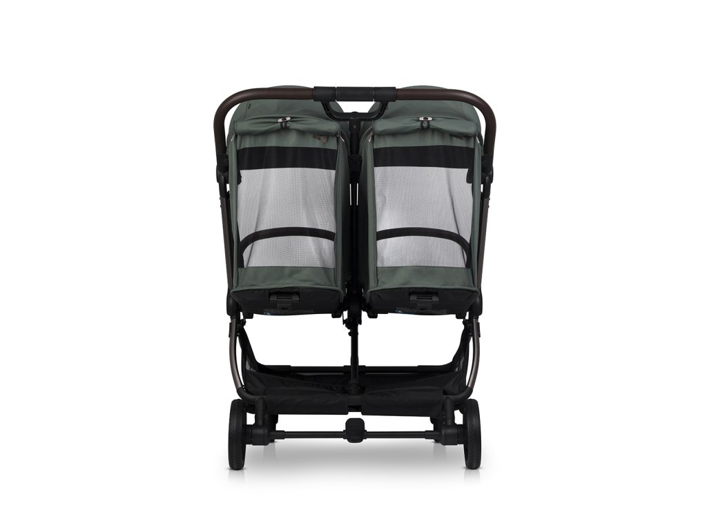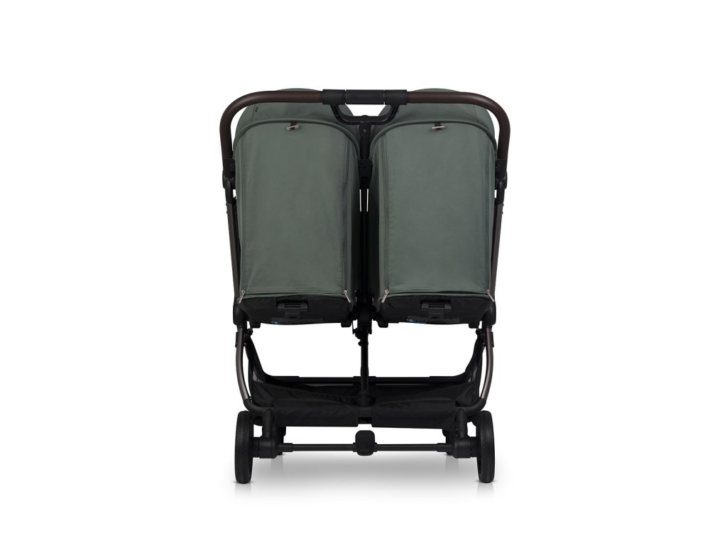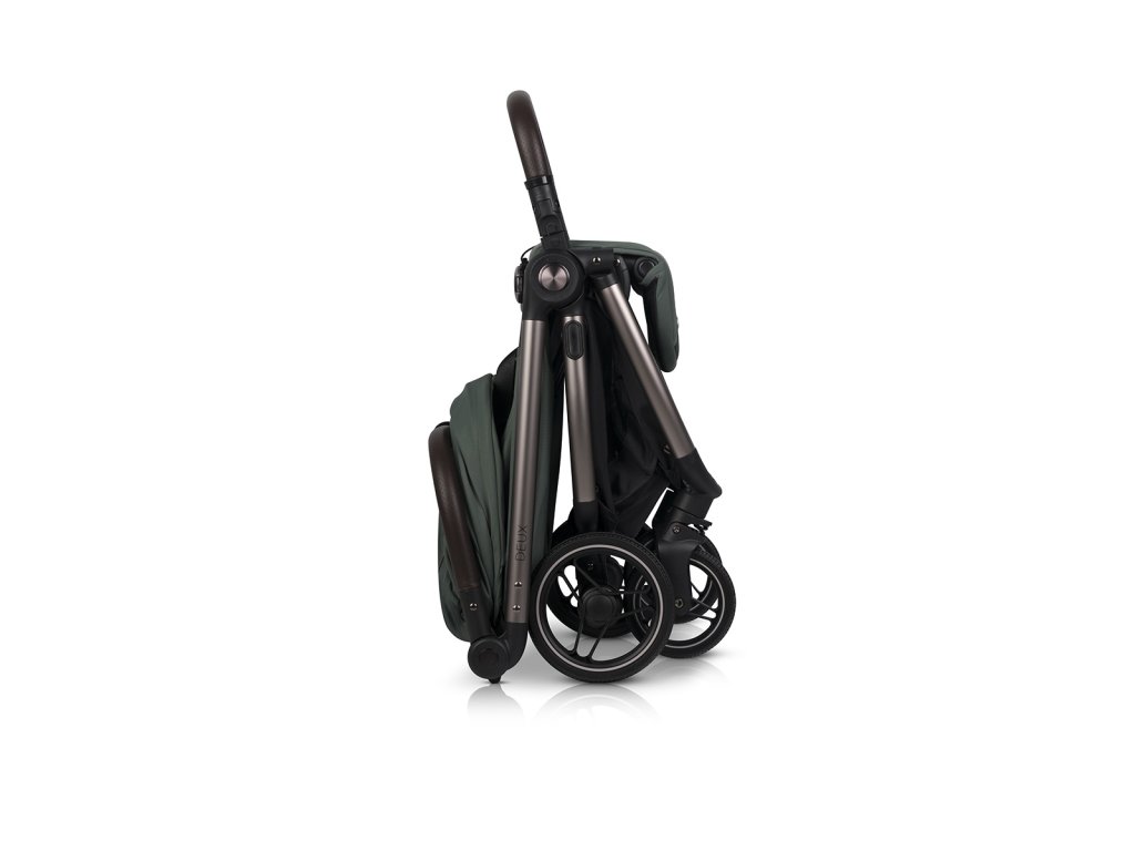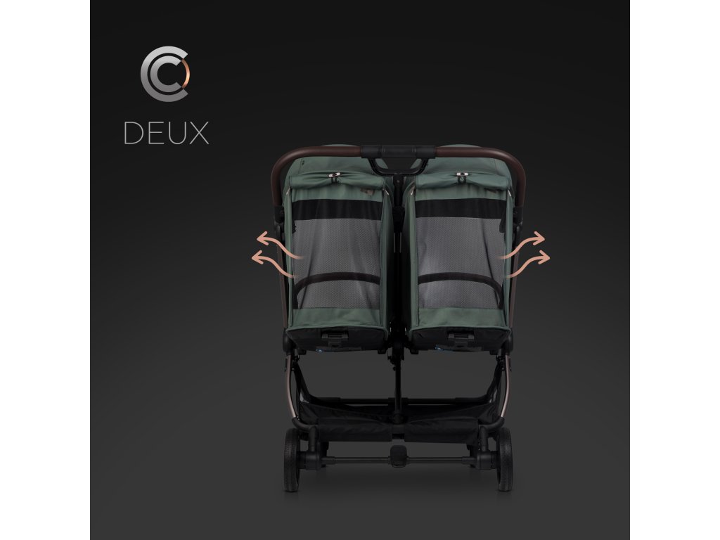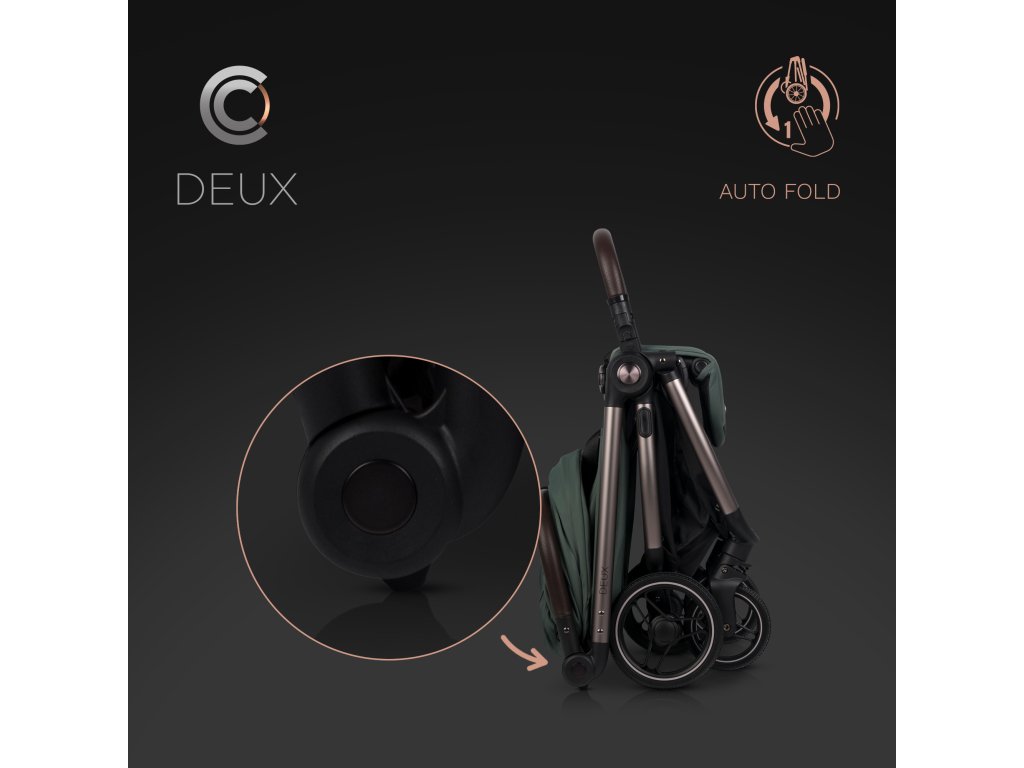 A DEUX egyedülálló automatikus összecsukórendszerrel van felszerelve, amelyet egy kézzel is működtethetsz. Egyszerűen aktiváld a mechanizmust, és told előre a fogantyút - a babakocsi automatikusan összecsukódik, mint egy inga, meglepően kompakt méretekre. Összecsukás után a babakocsi függőlegesen áll, és a korlát kényelmes hordozófogantyúként szolgál. Ez a rendszer hatalmas megkönnyebbülést jelent, különösen azokban a helyzetekben, amikor a babakocsit a csomagtérbe kell pakolni, és egyszerre két gyermeket kell felügyelned. Az ikrek számára babakocsi összecsukása még soha nem volt ilyen egyszerű.