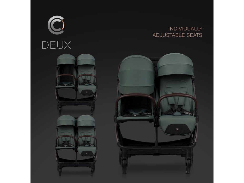 Minden ülés 3 pozícióba állítható háttámlával rendelkezik, amely a következő pozíciókat tartalmazza: teljesen fekvő, félig fekvő és teljesen ülő. A DEUX babakocsi lábtartói is állíthatók, és teljesen összecsukva kényelmes feljutást biztosítanak egy idősebb gyermek számára a lépcsőfokhoz. Az ülés szélessége 32 cm, a háttámla magassága 46 cm, az ülésmélység pedig 20 cm, ami elegendő helyet biztosít a kényelmes üléshez.
