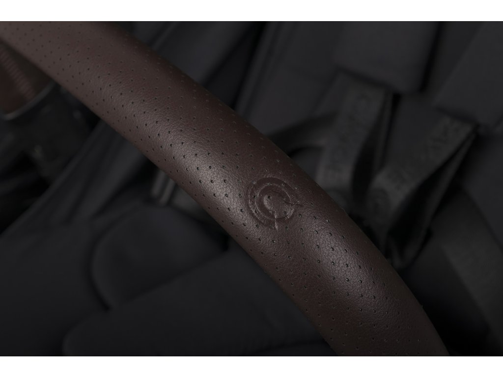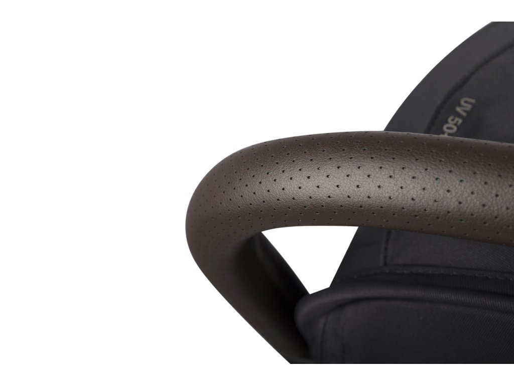 A babakocsi fogantyúja és a biztonsági korlátok a legmagasabb minőségű, szellőző eco-bőrrel vannak bevonva, divatos sötétbarna színben. A bőr puha és kényelmes, így a babakocsi kezelése és hordozása sokkal kényelmesebb.