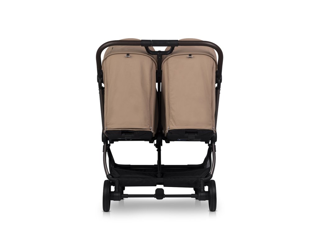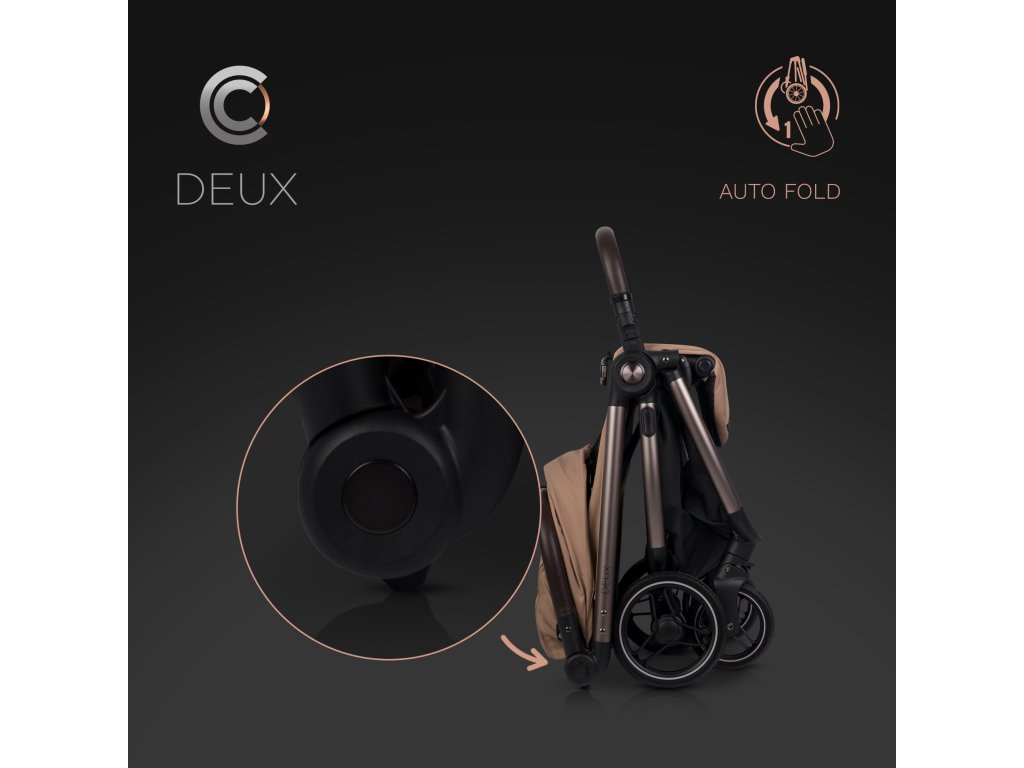 A DEUX egyedülálló automatikus összecsukórendszerrel van felszerelve, amelyet egy kézzel is működtethetsz. Egyszerűen aktiváld a mechanizmust, és told előre a fogantyút - a babakocsi automatikusan összecsukódik, mint egy inga, meglepően kompakt méretekre. Összecsukás után a babakocsi függőlegesen áll, és a korlát kényelmes hordozófogantyúként szolgál. Ez a rendszer hatalmas megkönnyebbülést jelent, különösen azokban a helyzetekben, amikor a babakocsit a csomagtérbe kell pakolni, és egyszerre két gyermeket kell felügyelned. Az ikrek számára babakocsi összecsukása még soha nem volt ilyen egyszerű.