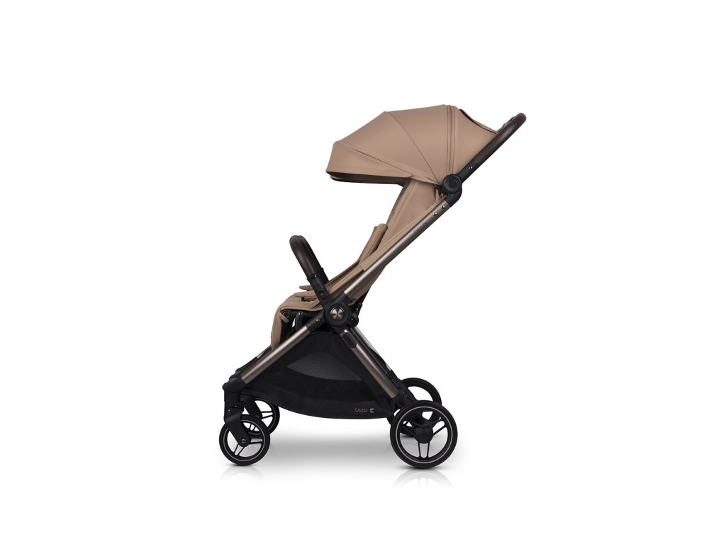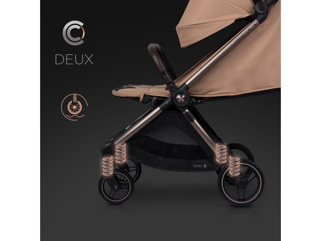 A CAVOE DEUX egy prémium termék, amely még a legigényesebb szülők elvárásait is kielégíti. A váz fém elemei divatos és elegáns barna-pezsgő színűre eloxáltak. Az eloxált váz sokkal karcállóbb, mint a hagyományos festett felületek, ami azt jelenti, hogy a babakocsi évekig tartó intenzív használat után is megőrzi tökéletes megjelenését.