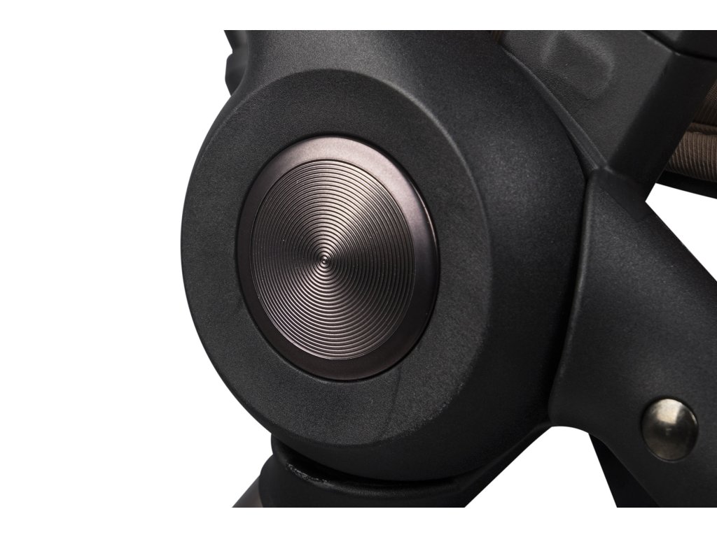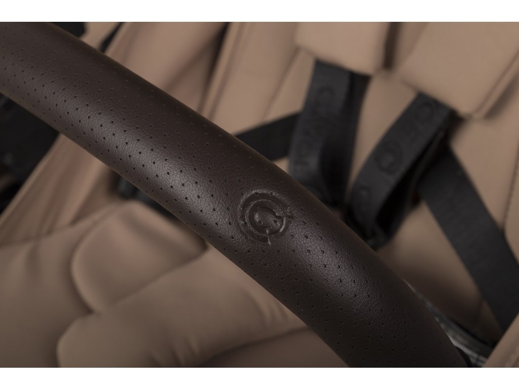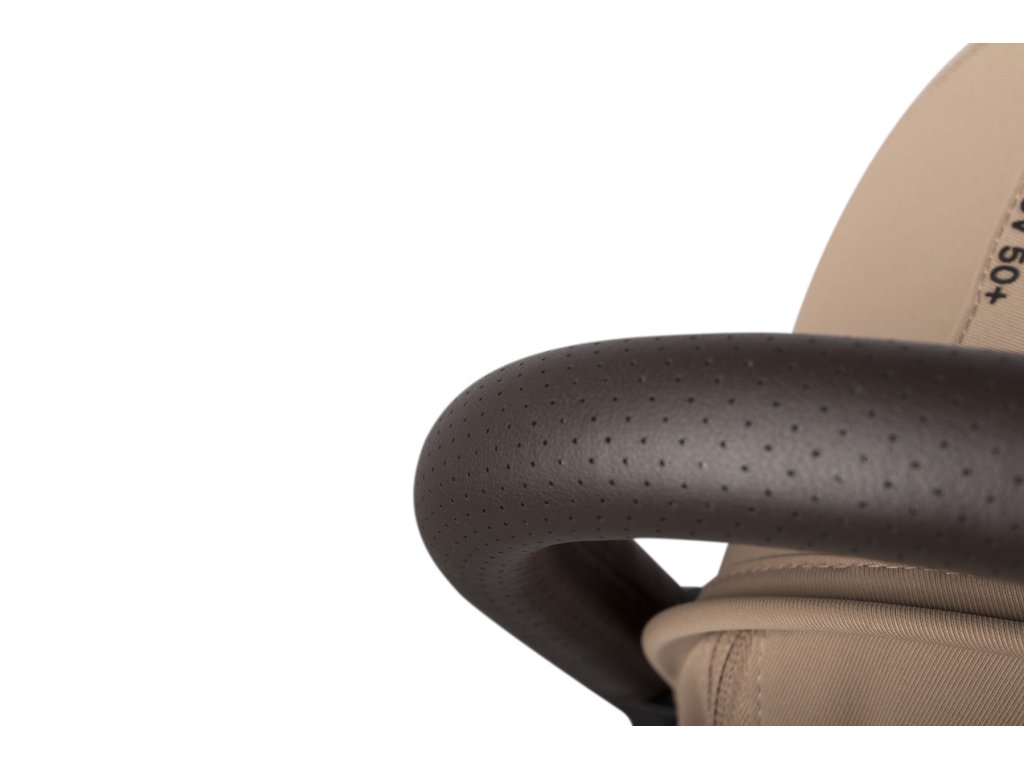 A babakocsi fogantyúja és a biztonsági korlátok a legmagasabb minőségű, szellőző eco-bőrrel vannak bevonva, divatos sötétbarna színben. A bőr puha és kényelmes, így a babakocsi kezelése és hordozása sokkal kényelmesebb.