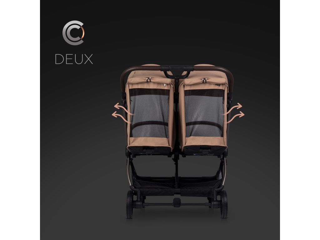 A DEUX iker babakocsi két független napellenzővel rendelkezik. Mindegyikhez tartozik egy további nyitható rész és egy napernyő. A napellenzők bővíthetőségének köszönhetően előre dönthetők, így megvédhetik a gyerekeket az alacsonyan fekvő naptól. A napellenző magassága az ülőfelülettől 66 cm, ami megfelelő védelmet nyújt.