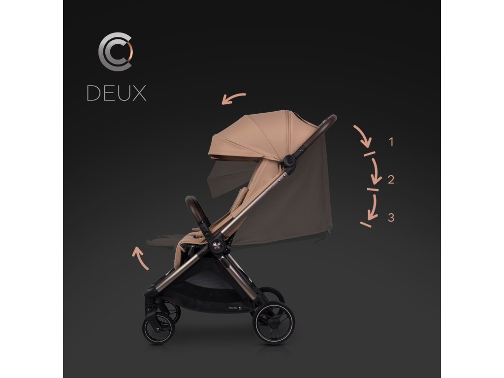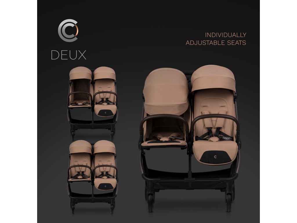 Minden ülés 3 pozícióba állítható háttámlával rendelkezik, amely a következő pozíciókat tartalmazza: teljesen fekvő, félig fekvő és teljesen ülő. A DEUX babakocsi lábtartói is állíthatók, és teljesen összecsukva kényelmes feljutást biztosítanak egy idősebb gyermek számára a lépcsőfokhoz. Az ülés szélessége 32 cm, a háttámla magassága 46 cm, az ülésmélység pedig 20 cm, ami elegendő helyet biztosít a kényelmes üléshez.