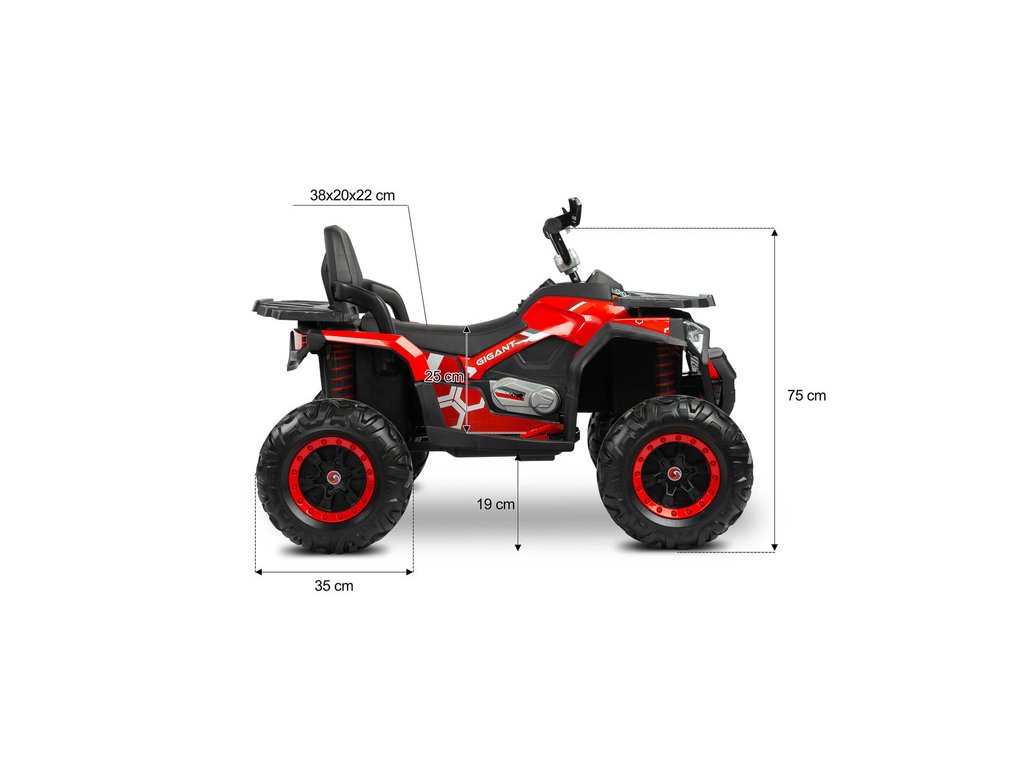 A GIGANT négy erőteljes, 45 W-os motorral van felszerelve , amelyek együttesen lenyűgöző , 180 W összteljesítményt biztosítanak . Ennek a rendkívüli teljesítménynek köszönhetően a quad könnyedén megbirkózik az egyenetlen felületekkel, a lejtőkkel és a nehezebb terepviszonyokkal is. Gyermeke biztos lehet benne, hogy a GIGANT soha nem fogja cserbenhagyni.