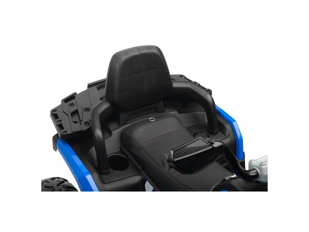 A tágas , 38 x 20 cm -es ülés ekológikus bőrrel kárpitozott , ami még hosszabb utakon is kényelmet biztosít. A 22 cm magas háttámla megfelelő testtartást és háttámaszt biztosít. A quad 116 x 75 x 80 cm -es teljes méretei elegendő helyet kínálnak 3-8 éves gyermekek számára, maximális teherbírása pedig akár 30 kg .