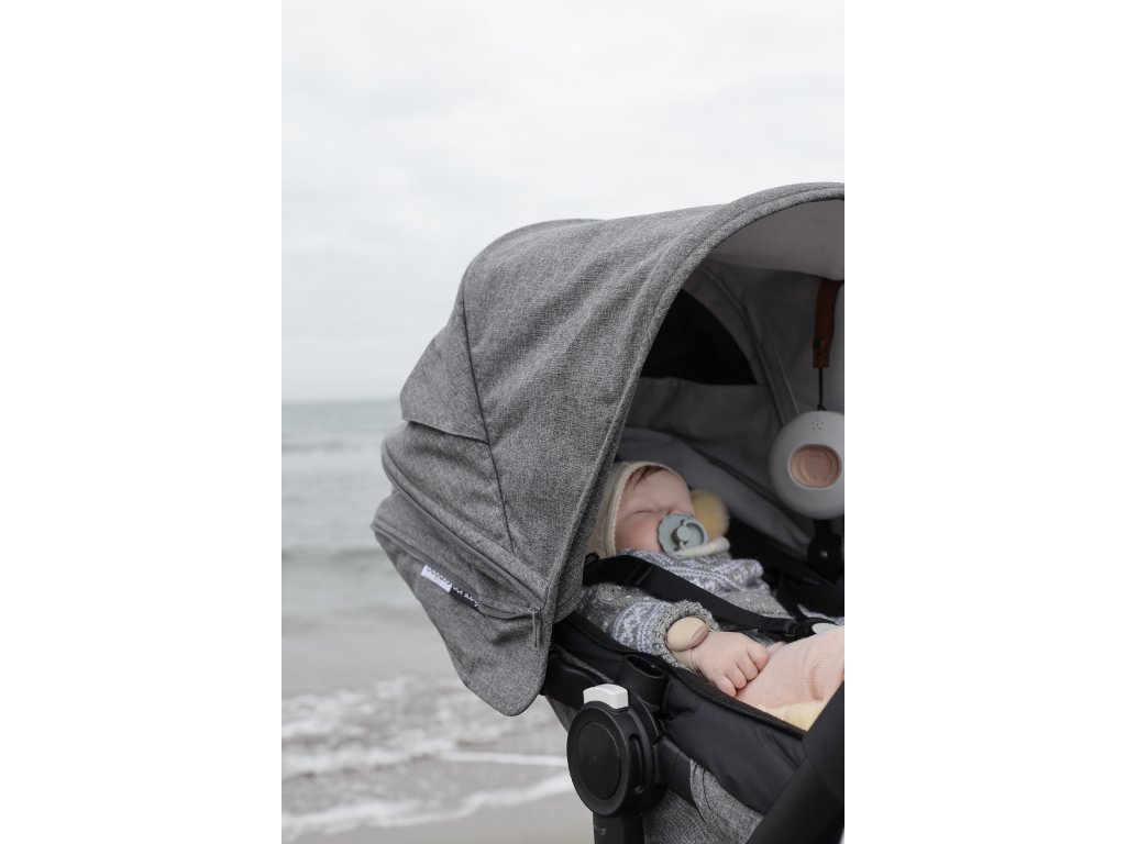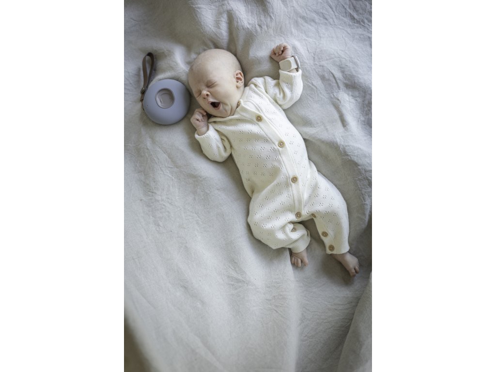 Fehér zajt játszik le:Nyugtató, altatódalos hang; fehér zaj. Ez segít a babának megnyugodni és elaludni.