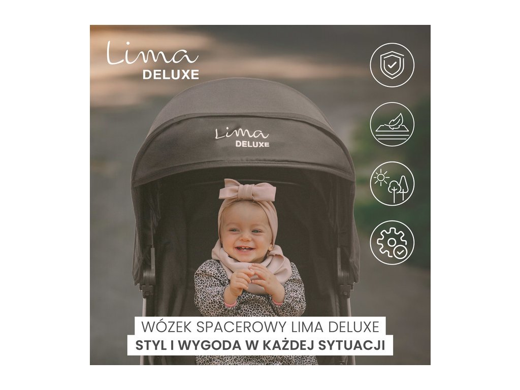 IDEÁLIS SZÜLŐK SZÁMÁRALima Deluxe je kočík, ktorý zaisťuje pohodlie dieťaťa aj rodiča. Ergonomická, nastaviteľná rukoväť uľahčuje ovládanie a veľký nákupný košík umožňuje uloženie všetkých potrebných vecí. |
