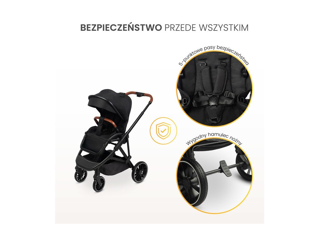 Első a Biztonság: A babakocsi 5 pontos biztonsági övekkel van felszerelve, amelyek stabilitást és teljes védelmet nyújtanak a séta során. A lábfék növeli a biztonságot a gyermek ellátása vagy a szabadtéri alvás közben.