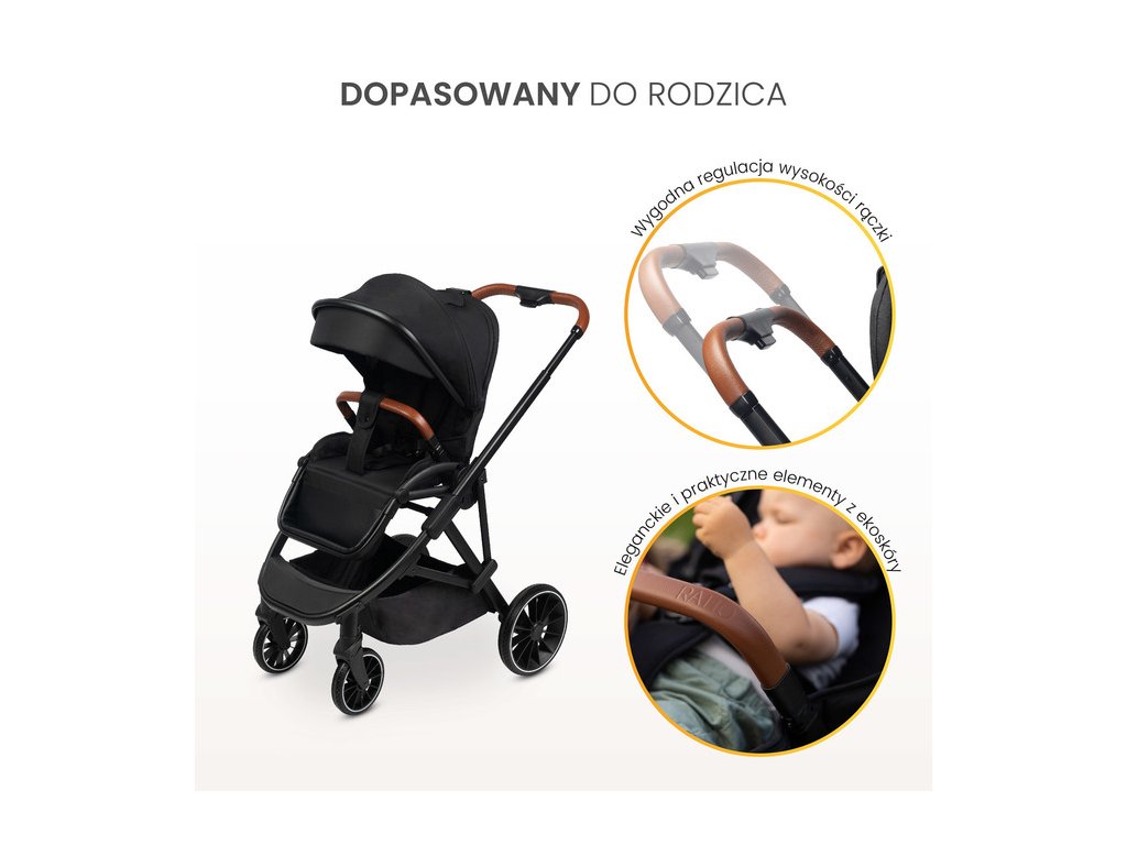 Szülőbarát: Az ökobőrrel borított állítható tolókar kényelmes irányítást biztosít, és tökéletesen alkalmazkodik a szülő igényeihez. Az ökobőr stílusos megjelenést kölcsönöz, és könnyen tisztítható.