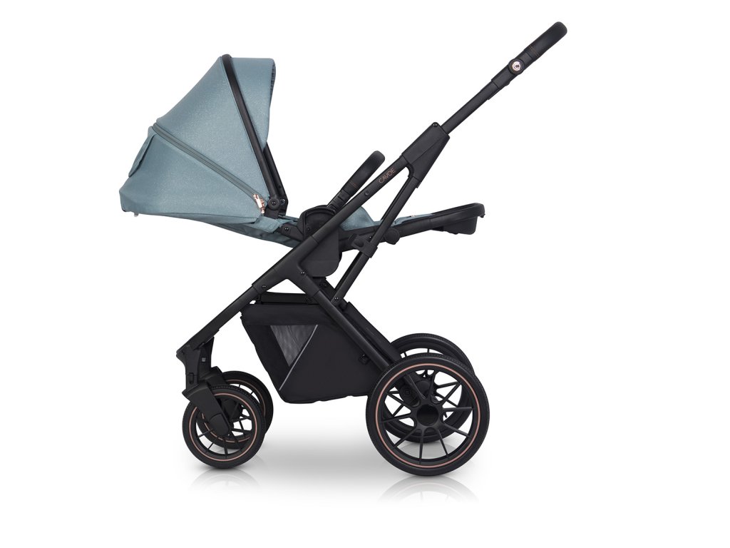 - Állítható fogantyúmagasság: Elegáns rozéarany fém elemekkel teszi lehetővé a babakocsi kényelmes irányítását különböző magasságú szülők számára.