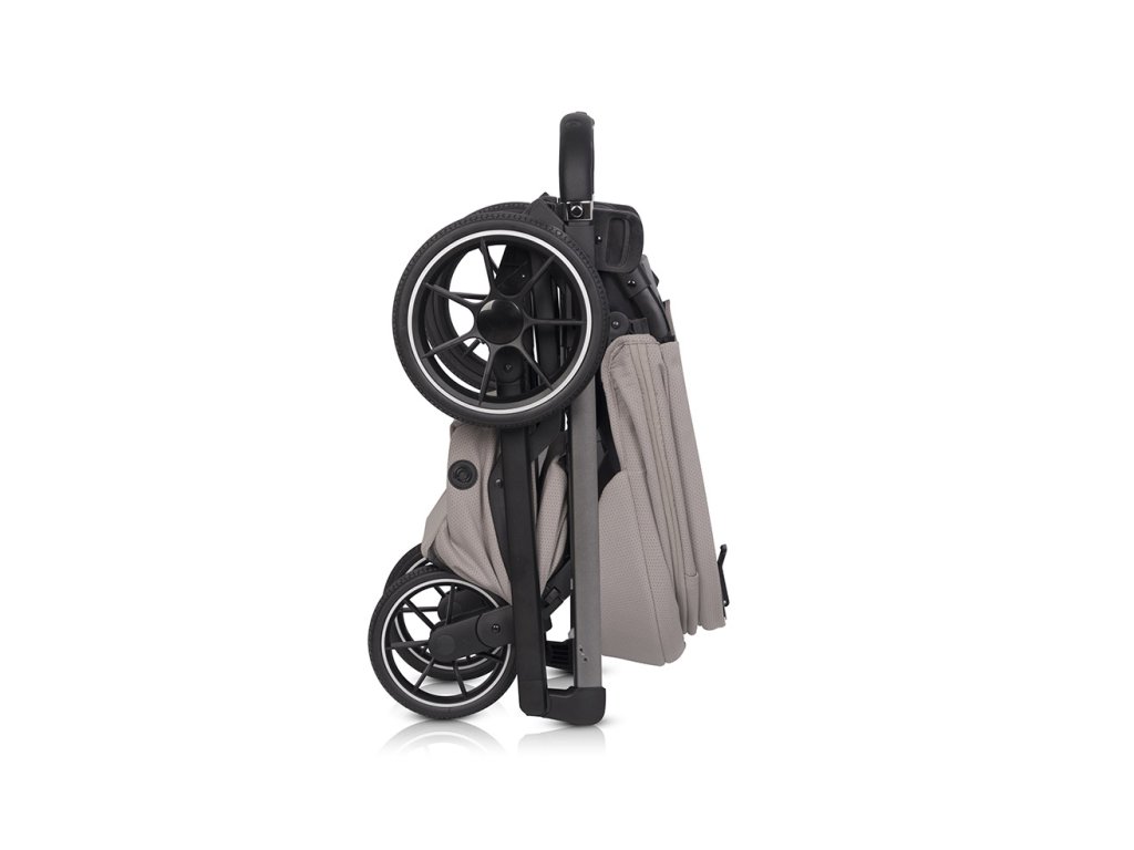 Összecsukva a babakocsi a saját kerekein áll. Ez kiküszöböli a huzatok véletlen beszennyeződésének vagy a talajon lévő szerkezet megkarcolódásának kockázatát. Az összecsukott Moi+-t függőlegesen is állíthatod, és magad után húzhatod, mint egy kerekes bőröndöt, ami ideális utazáshoz vagy repülőtereken és pályaudvarokon való mozgáshoz. Alacsony súlya és kompakt méretei (üléssel együtt mindössze 40 x 52 x 69 cm) megkönnyítik a hordozást és tárolást még egy kis lakásban vagy egy autó csomagtartójában is.
