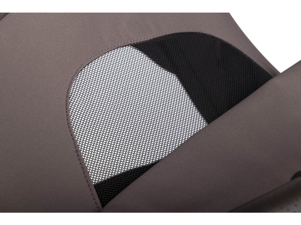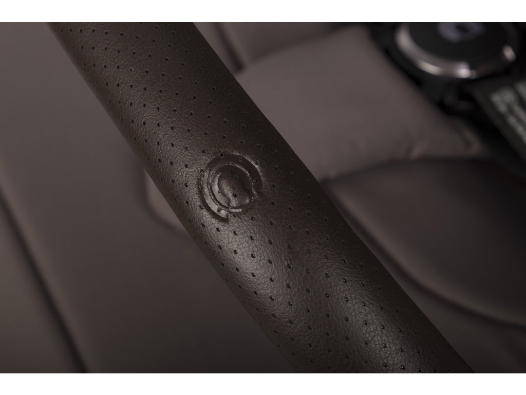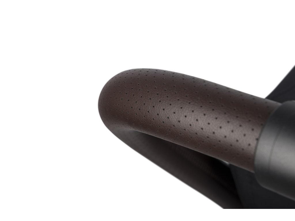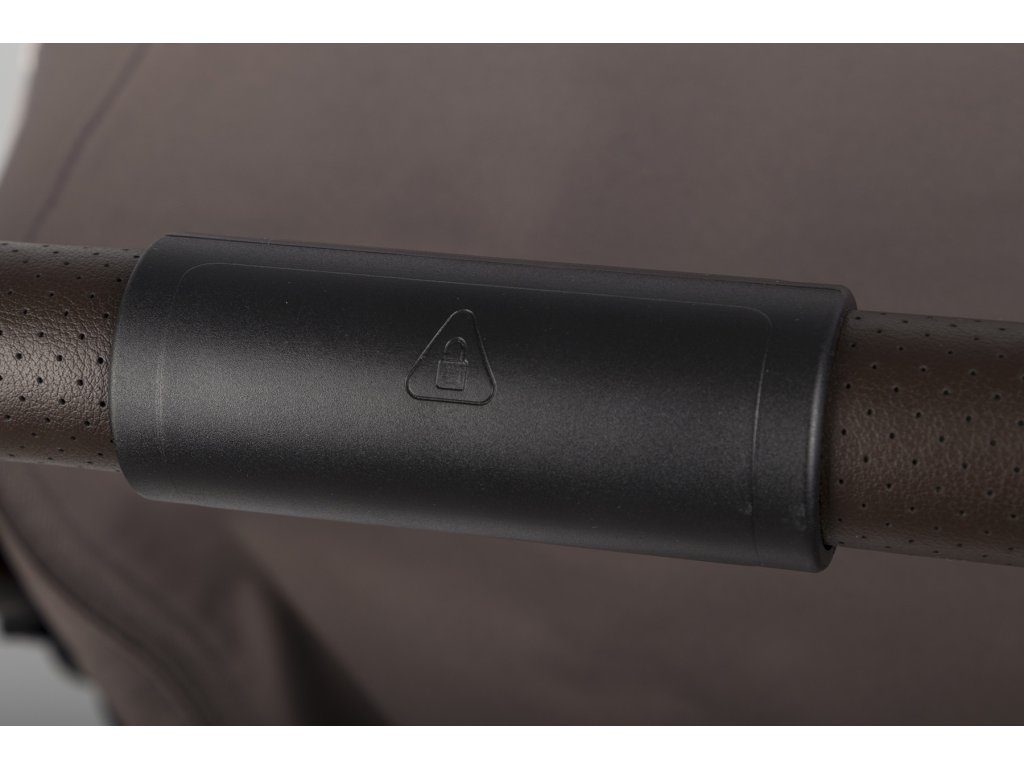 A fogantyú és a biztonsági védőburkolat bevonattal van ellátva kiváló minőségű, szellőző öko bőr modern sötétbarna színben. A bőr puha és kényelmes, ami jelentősen növeli a babakocsi vezetésének és hordozásának kényelmét. A fém emblémák tökéletesen illenek a modern kárpitozás színeihez és az eloxált vázhoz.