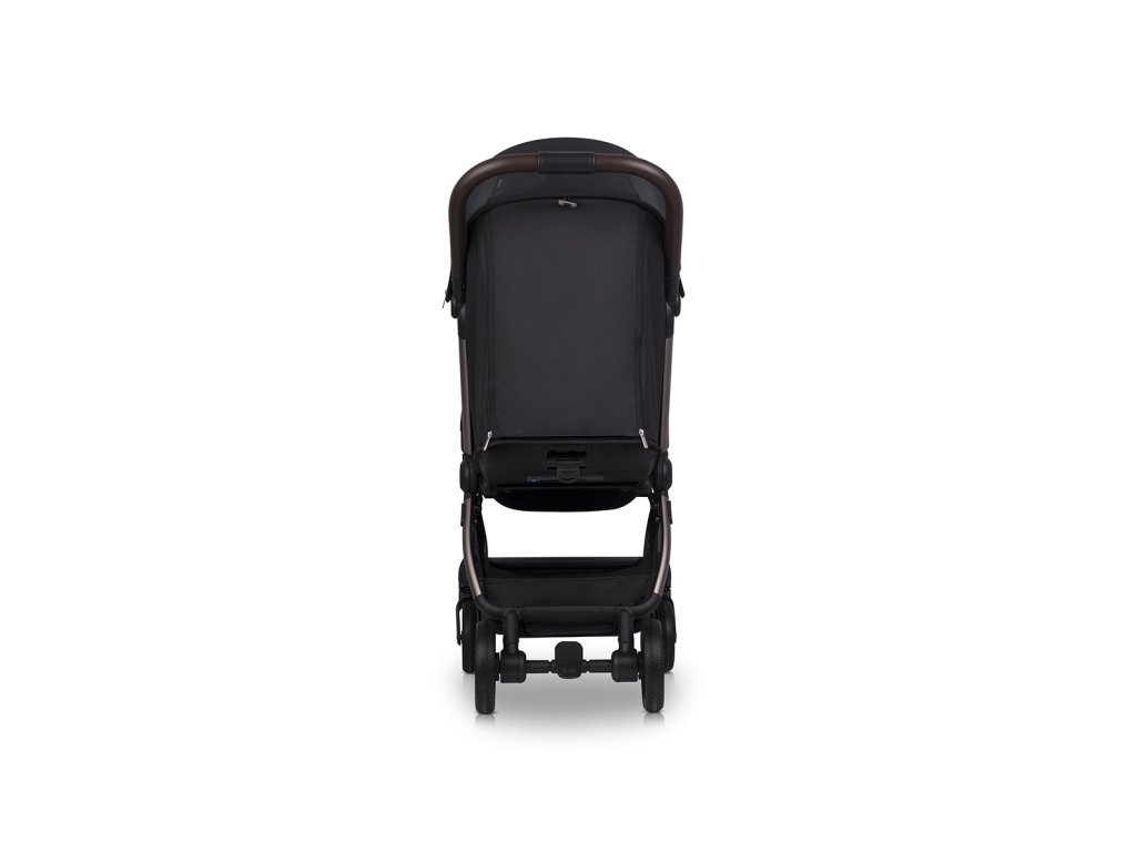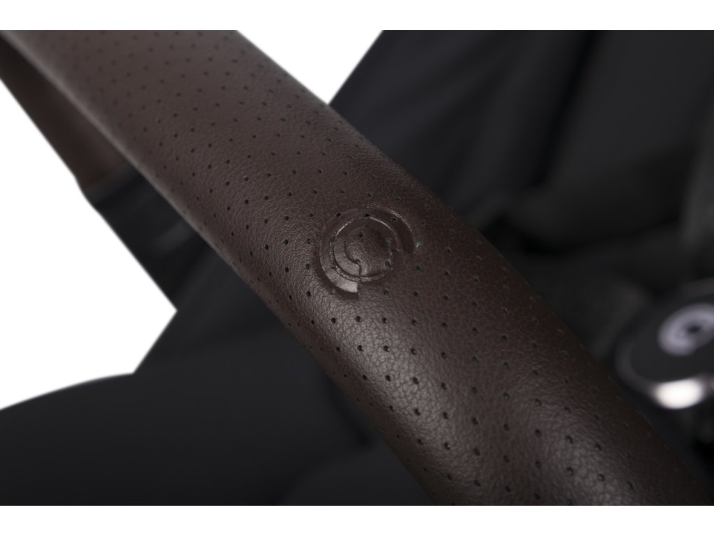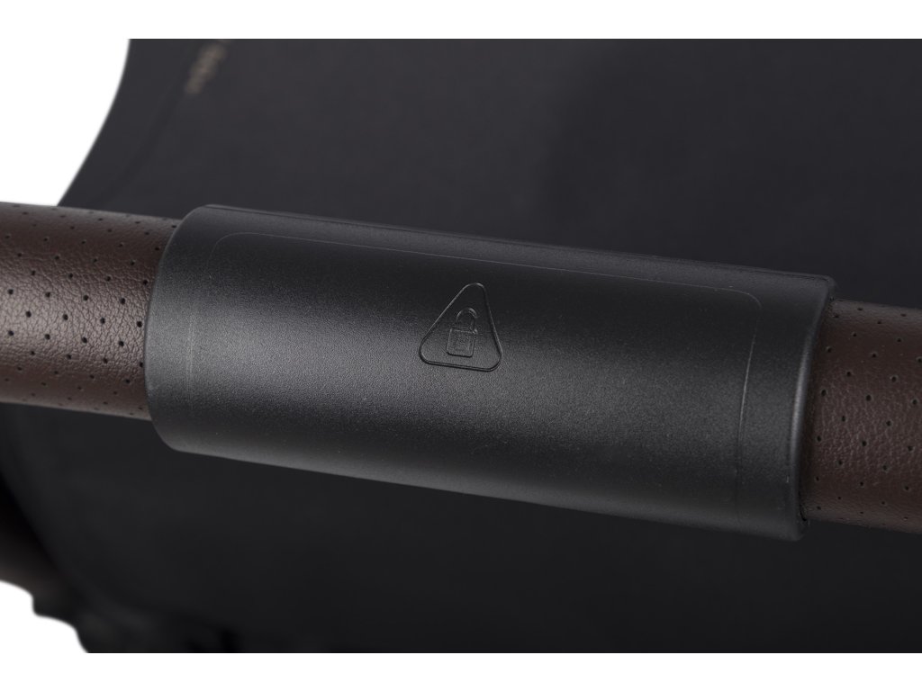 A fogantyú és a biztonsági védőburkolat bevonattal van ellátva kiváló minőségű, szellőző öko bőr modern sötétbarna színben. A bőr puha és kényelmes, ami jelentősen növeli a babakocsi vezetésének és hordozásának kényelmét. A fém emblémák tökéletesen illenek a modern kárpitozás színeihez és az eloxált vázhoz.