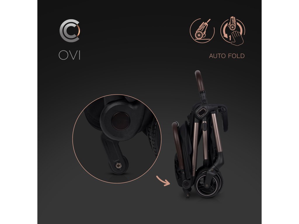 A CAVOE OVI babakocsi legnagyobb előnye a egyedi automatikus összecsukórendszer, amelyet mindössze egy kézzel is működtethetsz. Egyszerűen aktiváld a mechanizmust és told előre a fogantyút - a babakocsi automatikusan összecsukódik, mint egy inga, egy kis bőrönd méretére. Összecsukva a babakocsi függőlegesen áll, a biztonsági korlát pedig praktikus hordozófogantyúként szolgál.