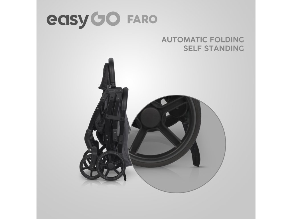 - Automatikus összecsukó rendszer: A Faro babakocsi automatikus összecsukórendszerrel van felszerelve, amely lehetővé teszi a könnyű, egykezes összecsukást. Összecsukás után a babakocsi függőleges helyzetben marad, a védőkorlát pedig kényelmes hordozófogantyúként szolgál.