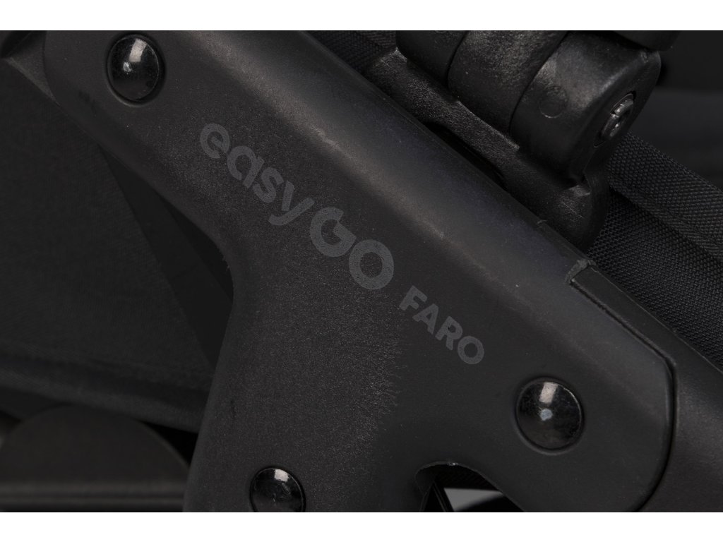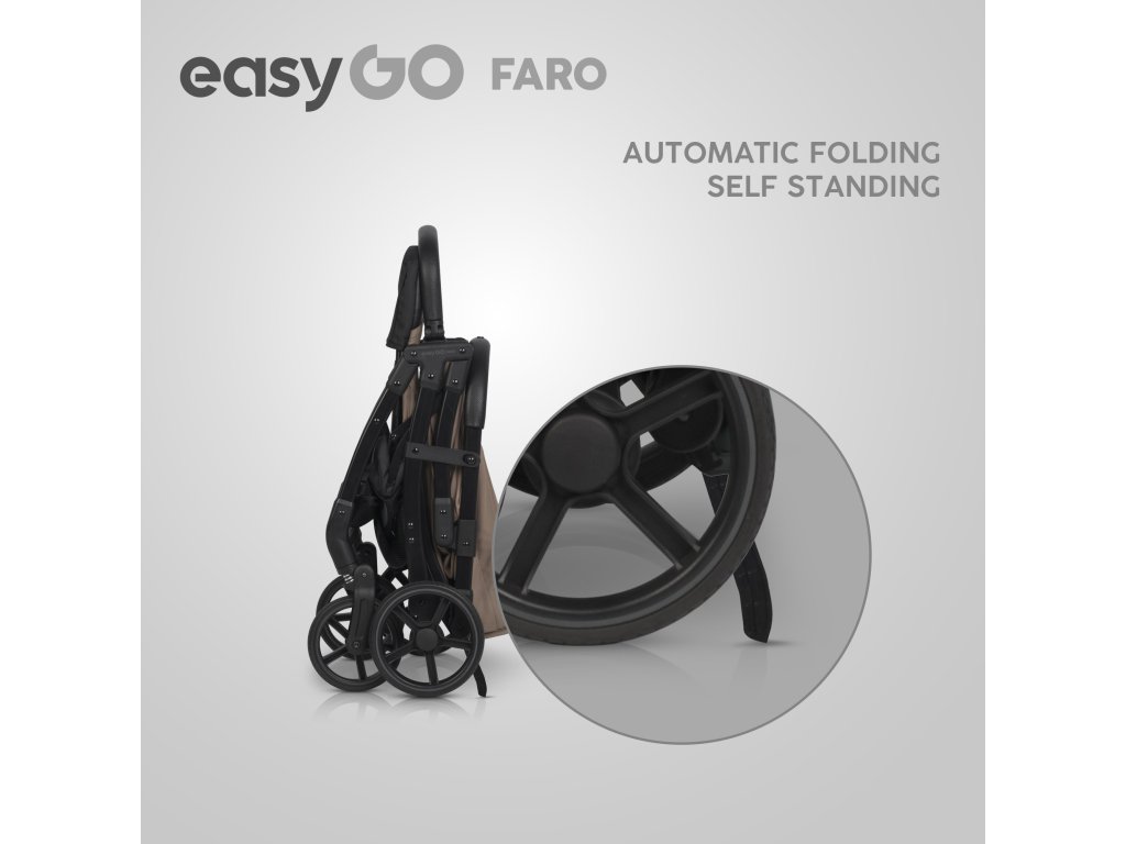 - Automatikus összecsukó rendszer: A Faro babakocsi automatikus összecsukórendszerrel van felszerelve, amely lehetővé teszi a könnyű, egykezes összecsukást. Összecsukás után a babakocsi függőleges helyzetben marad, a védőkorlát pedig kényelmes hordozófogantyúként szolgál.