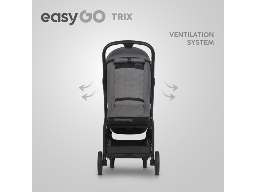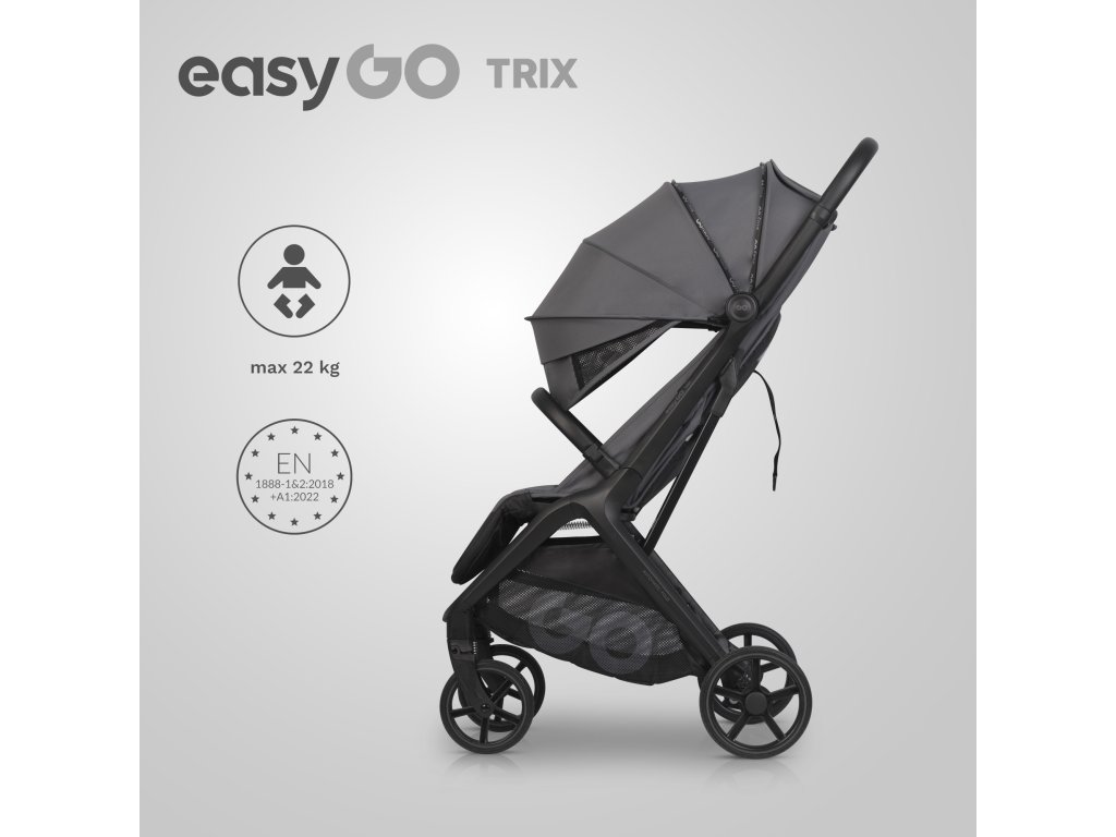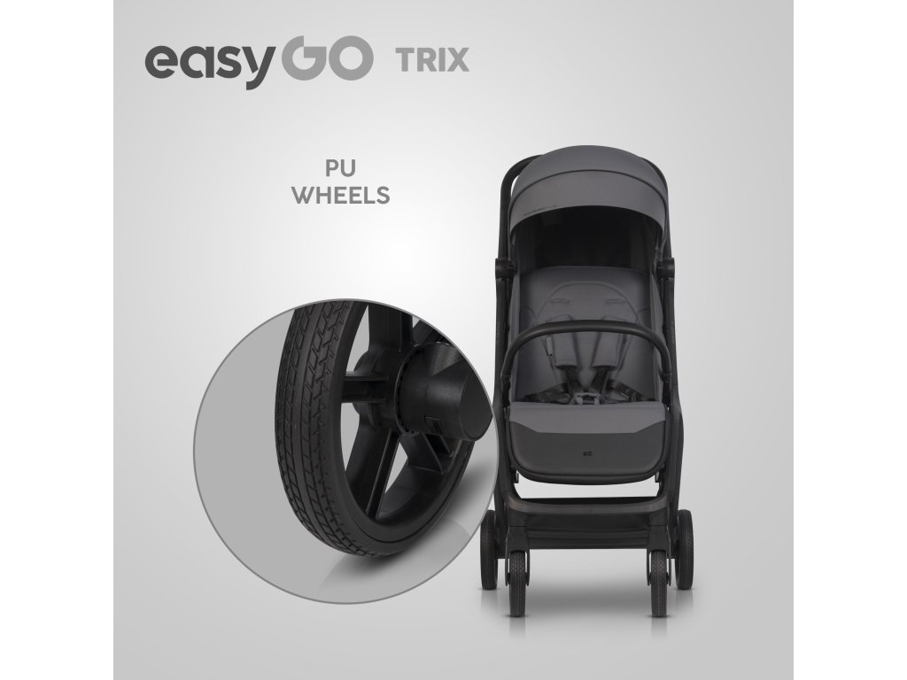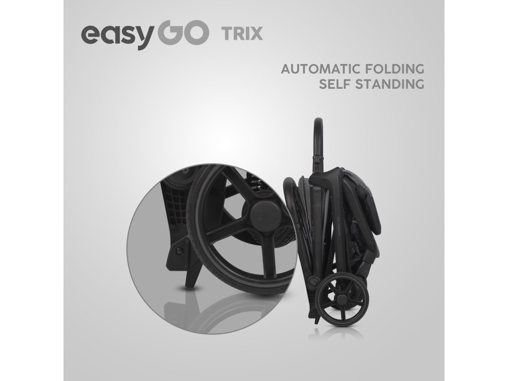 Innovatív automatikus összecsukás: Az EasyGo TRIX babakocsi automatikus összecsukórendszerrel van felszerelve, amely lehetővé teszi, hogy egy kézzel összecsukd a babakocsit. Egyszerűen engedd el a fogantyún lévő mechanizmust, és a babakocsi magától összecsukódik szabadon álló helyzetbe. Ez a rendszer ideális azoknak a szülőknek, akik gyakran összehajtják a babakocsit, és autóban szállítják.