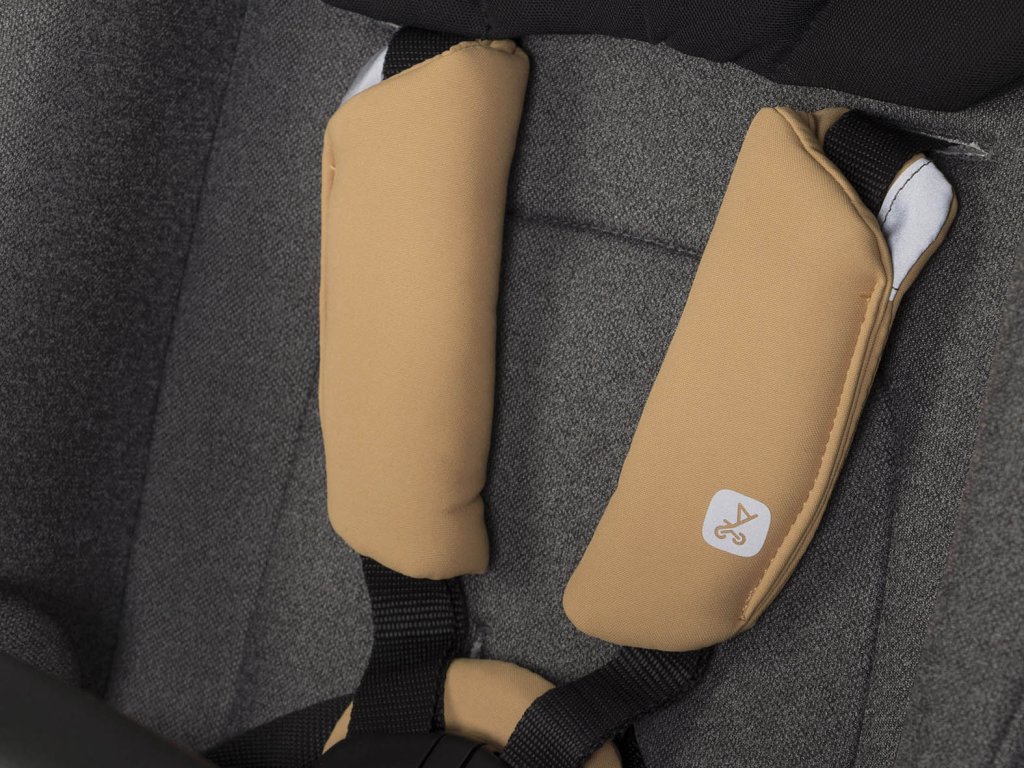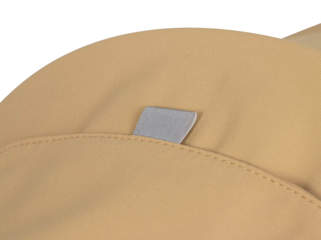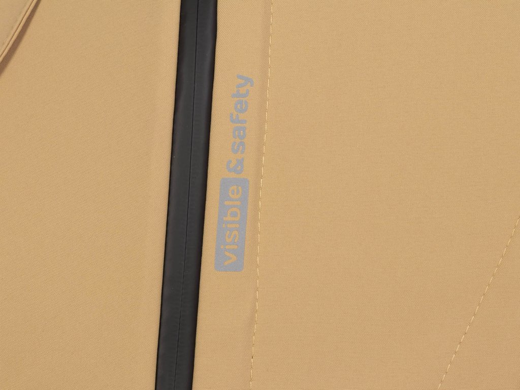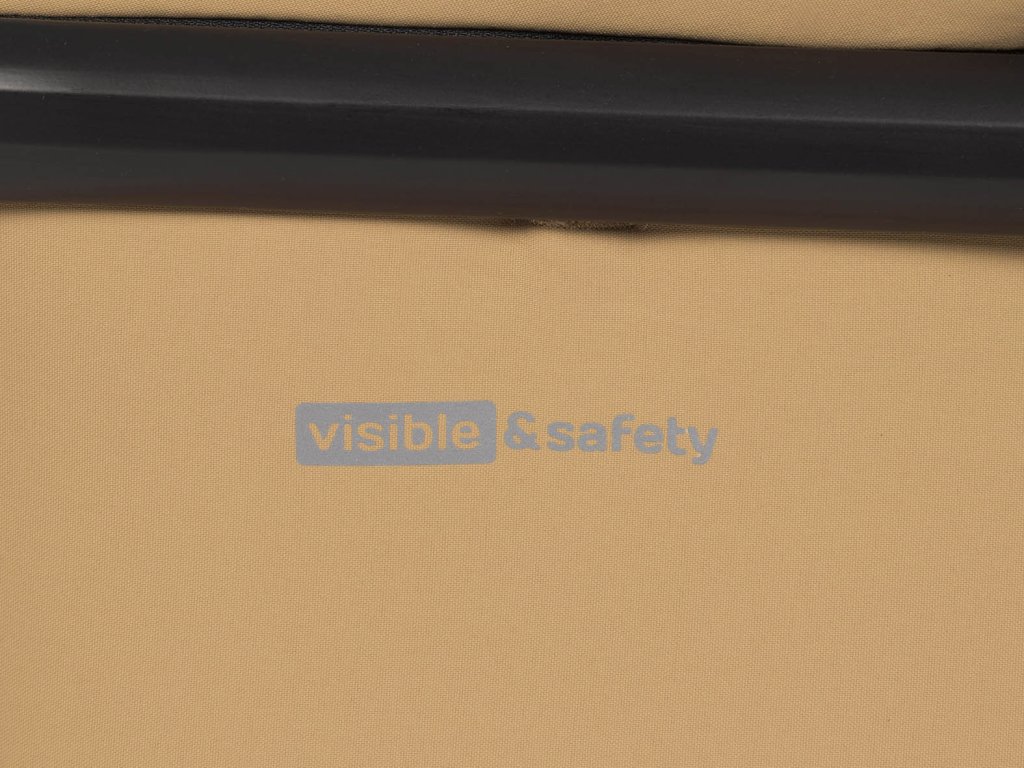 Modern kialakítás és biztonság: A kárpitozás divatos és kényelmes "melange" anyagból készült, amely jól elfedi a szennyeződéseket. A fényvisszaverő minták és elemek növelik a láthatóságot és a biztonságot az esti séták során.