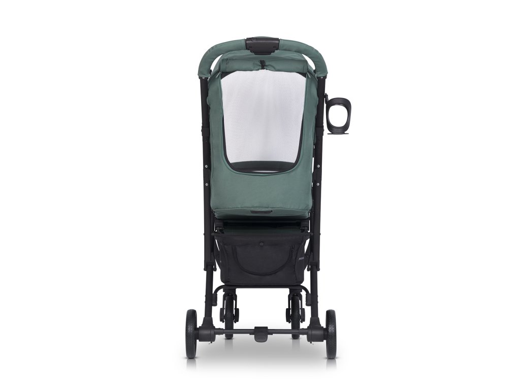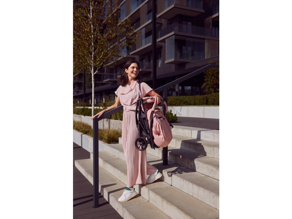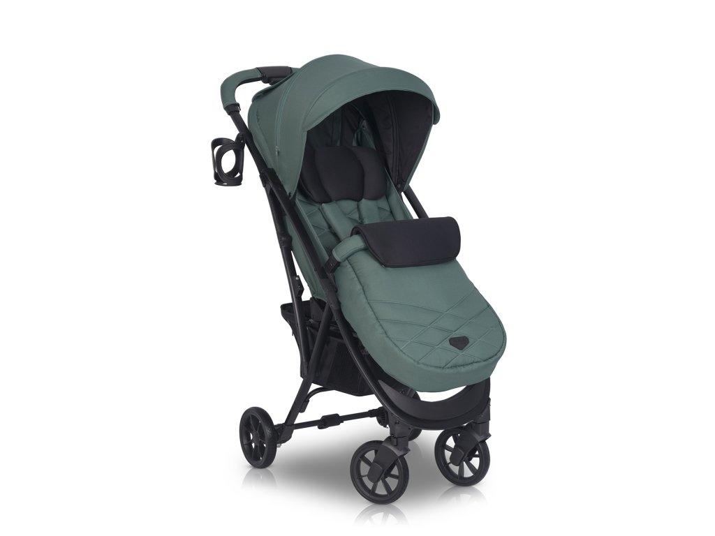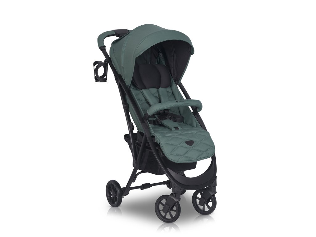 - Könnyű kezelhetőség: Forgatható első kerekek zárható opcióval, az összecsukott babakocsi automatikus rögzítése és számos egyéb praktikus funkció, például palacktartó és szállítótáska.