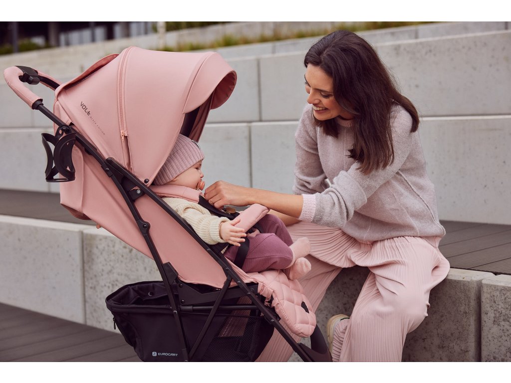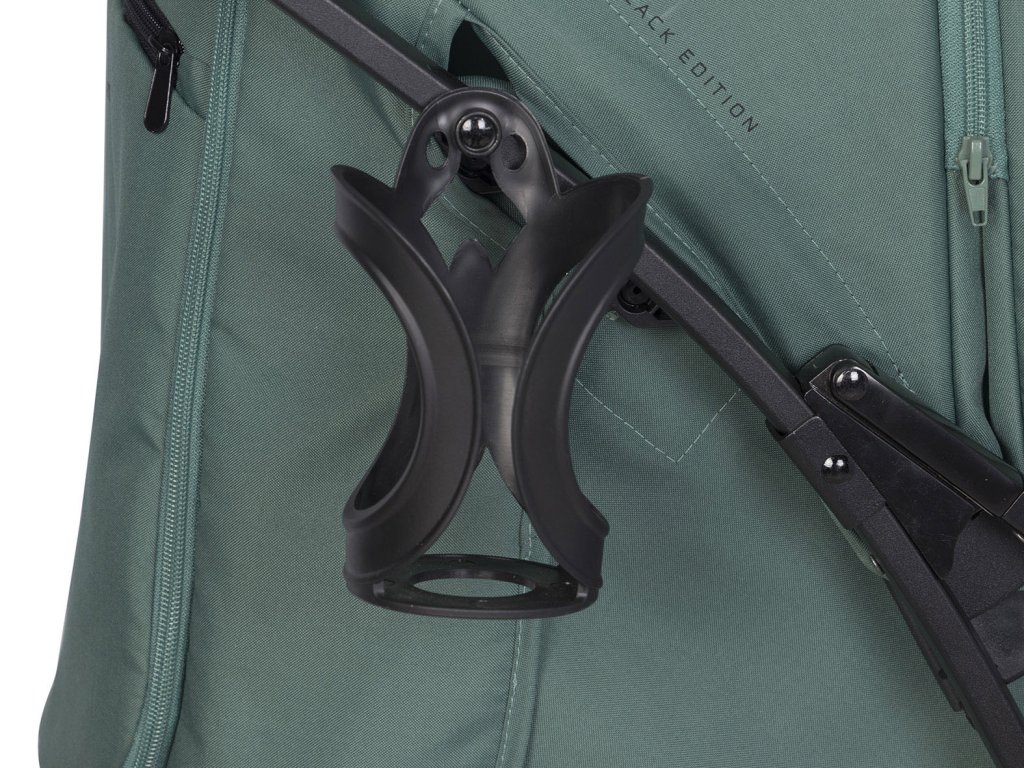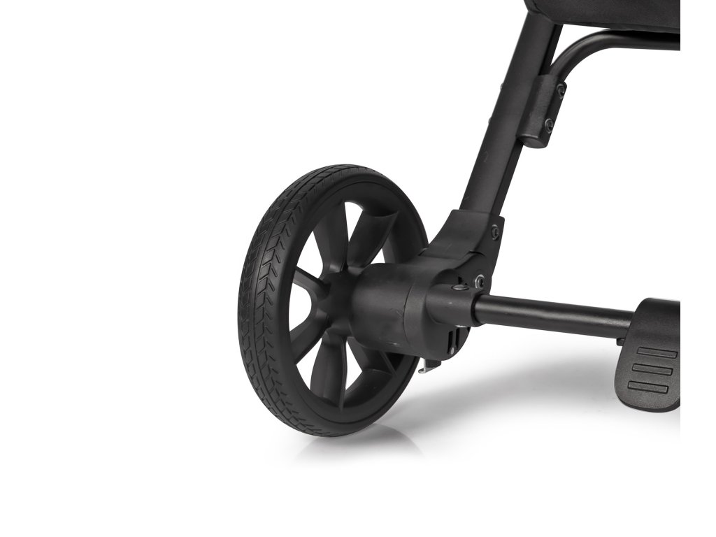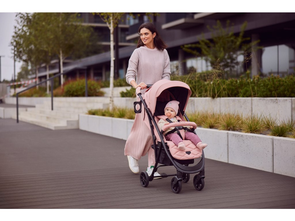 - Könnyű kezelhetőség: Forgatható első kerekek zárható opcióval, az összecsukott babakocsi automatikus rögzítése és számos egyéb praktikus funkció, például palacktartó és szállítótáska.