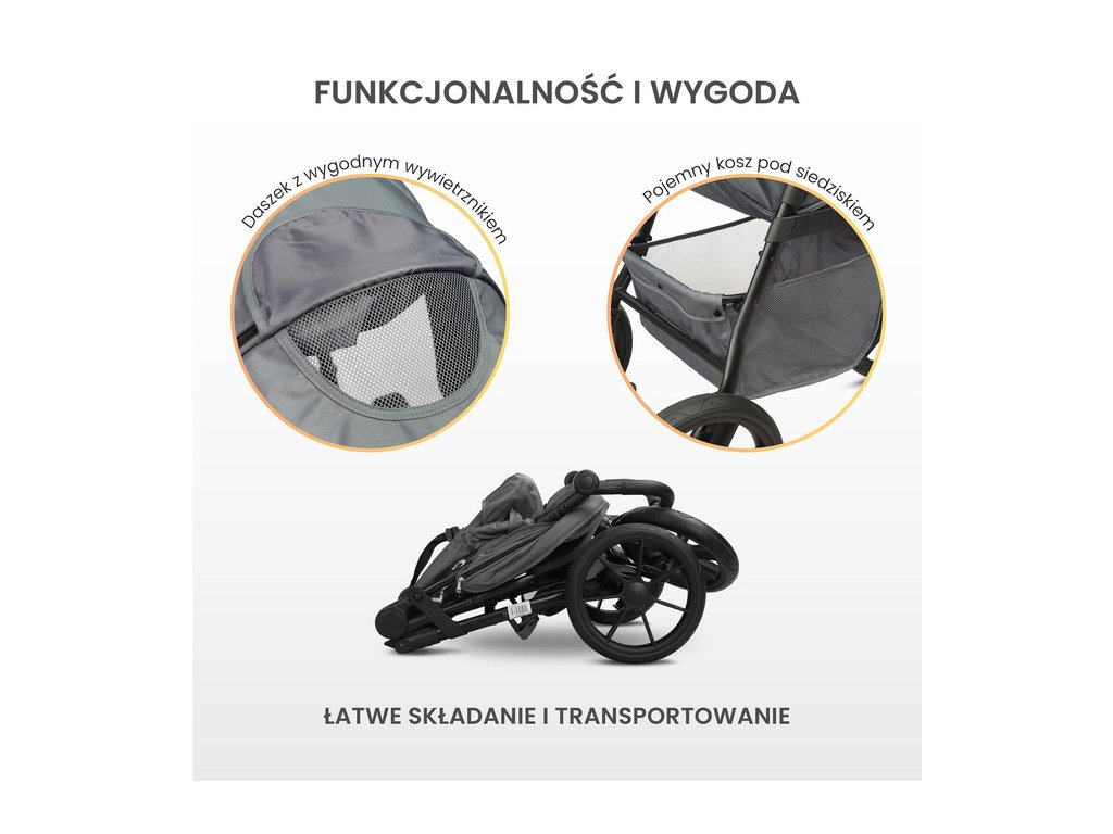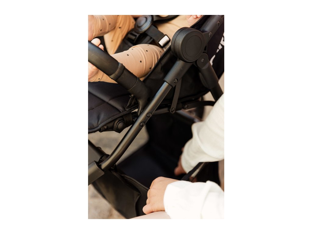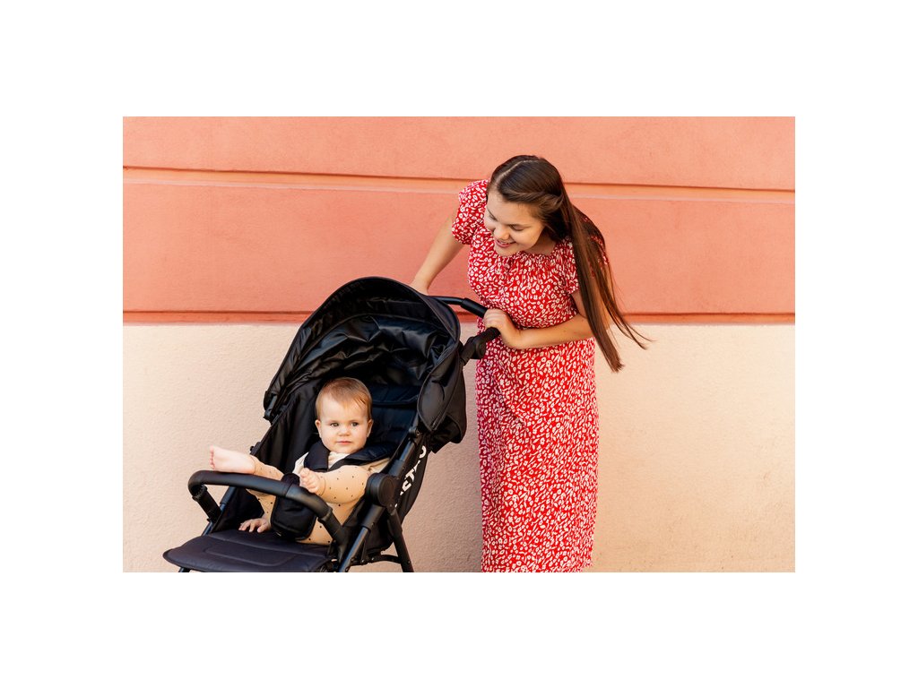 - Egyszerű összecsukás: A babakocsi könnyen és gyorsan összecsukható kompakt méretűre (80x60x43 cm), ami megkönnyíti a szállítást és tárolást.