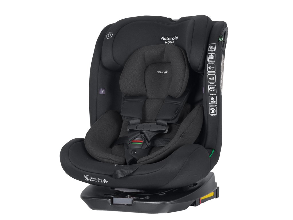 Asteroid i-Size autósülés Az univerzális gyerekülés megfelel a modern I-Size szabványnak. Oldalütközés elleni védelemmel, Isofix rögzítőrendszerrel, Top Tether hevederrel és 360°-os forgathatósággal rendelkezik. Kiegészítő övzárral. Példa az ülés beszerelésére 15 hónapos kortól, 40-105 cm magasságú (18 kg-ig terjedő) gyermekek szállítására, az európai országok tanúsítási szabványának – I-SIZE R129/03 – megfelelően. Maximális dőlésszög: 145°. A Top Tether heveder biztosítja az ülés biztonságos rögzítését. A készlet tartalmaz egy anatómiai betétet (0+ csoporthoz). Ez a baba vízszintesebb helyzetének biztosítására szolgál az autósülésben. A 360°-os forgatás lehetővé teszi az ülésirány egyszerű megváltoztatását és a kis utas kényelmes beszállását. Dőlésszög „menetiránynak megfelelő” helyzetben: 102°–114°. 3 dönthető pozíció. 15 hónapos kortól (76 cm magasságtól) alkalmas gyermekek szállítására. Az állítható fejtámla memóriahabos anyagból készült, és 10 pozíciót kínál, így az autósülés a gyermek növekedéséhez igazítható. 105 cm magasságig (kb. 18 kg) az autósülés saját biztonsági öveit kell használni, utána pedig a jármű szokásos biztonsági öveit. A gyermek biztonságát a biztonsági öv és az 5 pontos, nagy szilárdságú zár biztosítja. A zár nyomógombja zöld záródásjelzővel és jól hallható kattanó hanggal rendelkezik, amely megakadályozza a helytelen használatot. A biztonsági övek 18 kg-ig terjedő súlyú gyermekek számára készültek.Kiegészítő paraméterek