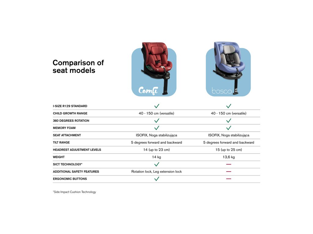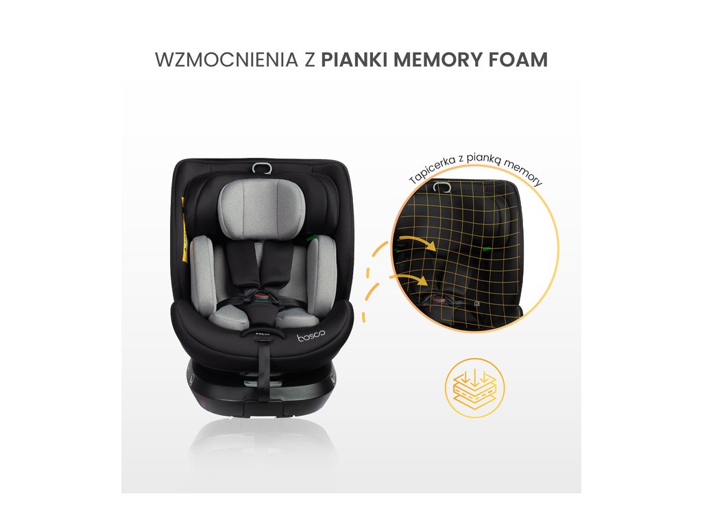 - Biztonsági szabványok: A Bosco modell megfelel az R129/i-Size szabványnak, amely garantálja a legmagasabb biztonsági előírásokat.