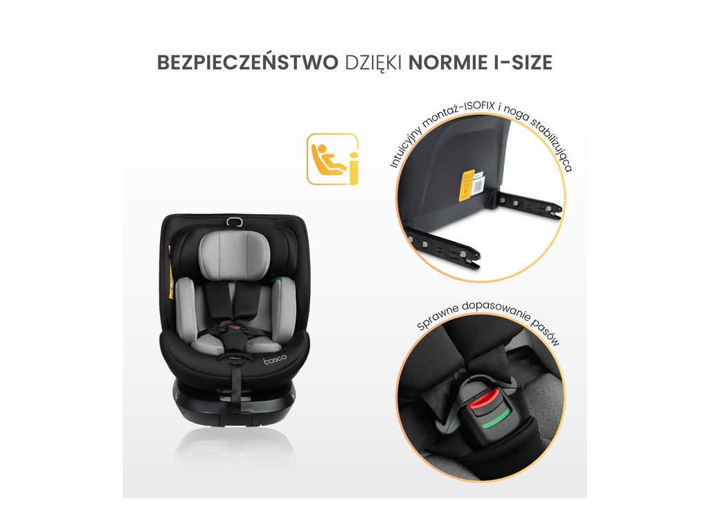 - Biztonsági szabványok: A Bosco modell megfelel az R129/i-Size szabványnak, amely garantálja a legmagasabb biztonsági előírásokat.