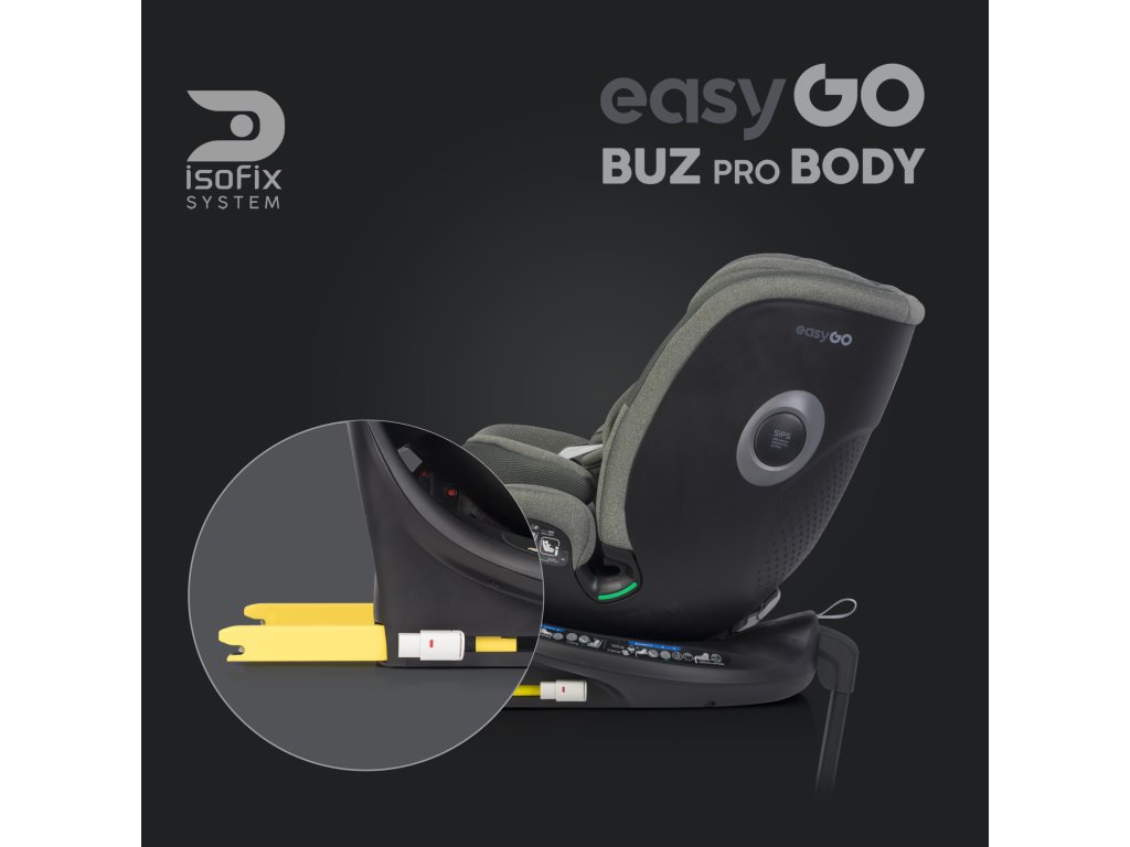 - 2 az 1-ben szett: A Buz Pro Body-t úgy tervezték, hogy kiegészítse az EasyGo Buz Pro autósülést, lehetővé téve egy ISOFIX forgótalp használatát mindkét üléshez.