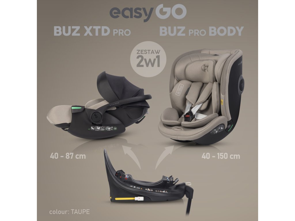 Autósülés-szett EasyGo Buz Xtd Pro és Buz Pro Body 2 az 1-ben képvisel átfogó, biztonságos és gazdaságos megoldás gyermekek autóban történő szállításáért születésüktől az autósülés használatára vonatkozó kötelezettség végéig. Köszönjük innovatív rendszer, egyetlen megosztott, forgó ISOFIX talppal Nemcsak pénzt takaríthat meg, hanem maximális kényelmet is élvezhet a mindennapi használat során.