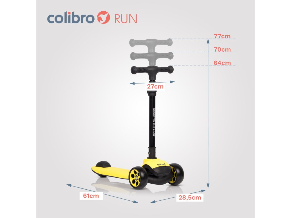 - A kihajtogatott roller méretei: 61 cm x 28,5 cm x 64 - 77 cm (kormány beállításától függően)