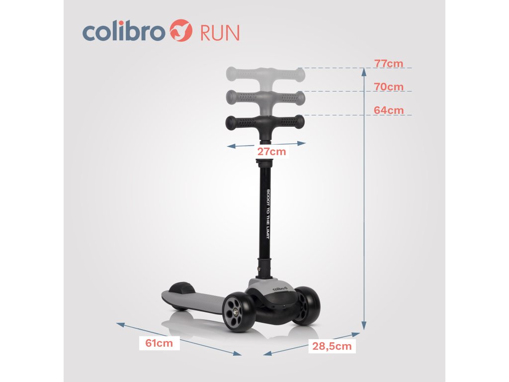 A Colibro Run gyerek roller tökéletes társ a kis kalandorok számára 3 éves kortól, maximum 50 kg súlyig. Ez a háromkerekű, összecsukható roller LED világítással nemcsak szórakozást, hanem biztonságot és tartósságot is kínál.