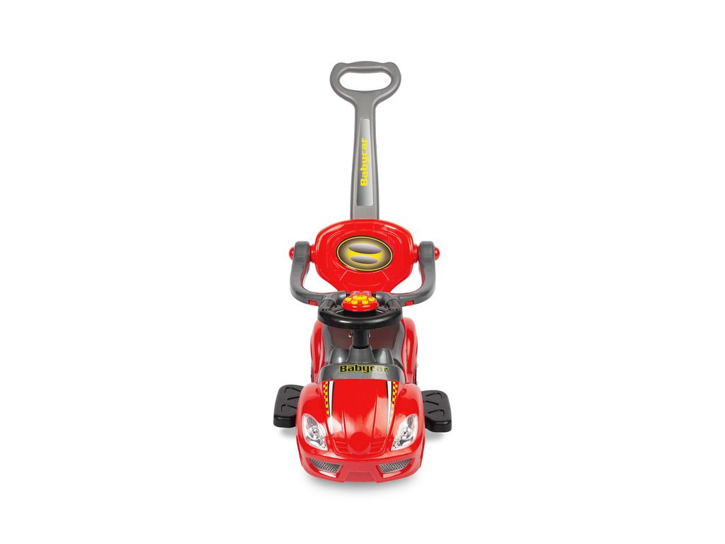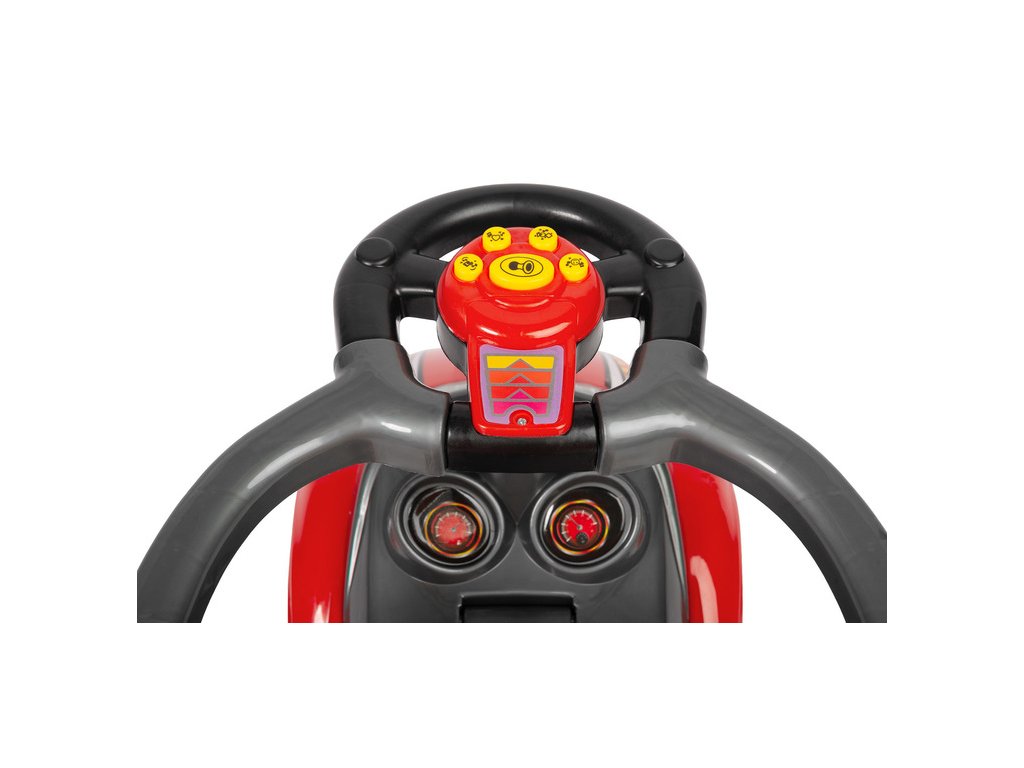 A versenyautó stílusú bébitaxi azonnal lenyűgözi a sebesség minden kis rajongóját. A modell hangpanellel van felszerelve, amely autentikus élményt nyújt a versenyzős játékhoz és támogatja a gyermek érzékszervi fejlődését. A műszerfal imitáció és a vonzó színes kivitel minden utazásból izgalmas kalandot varázsol.